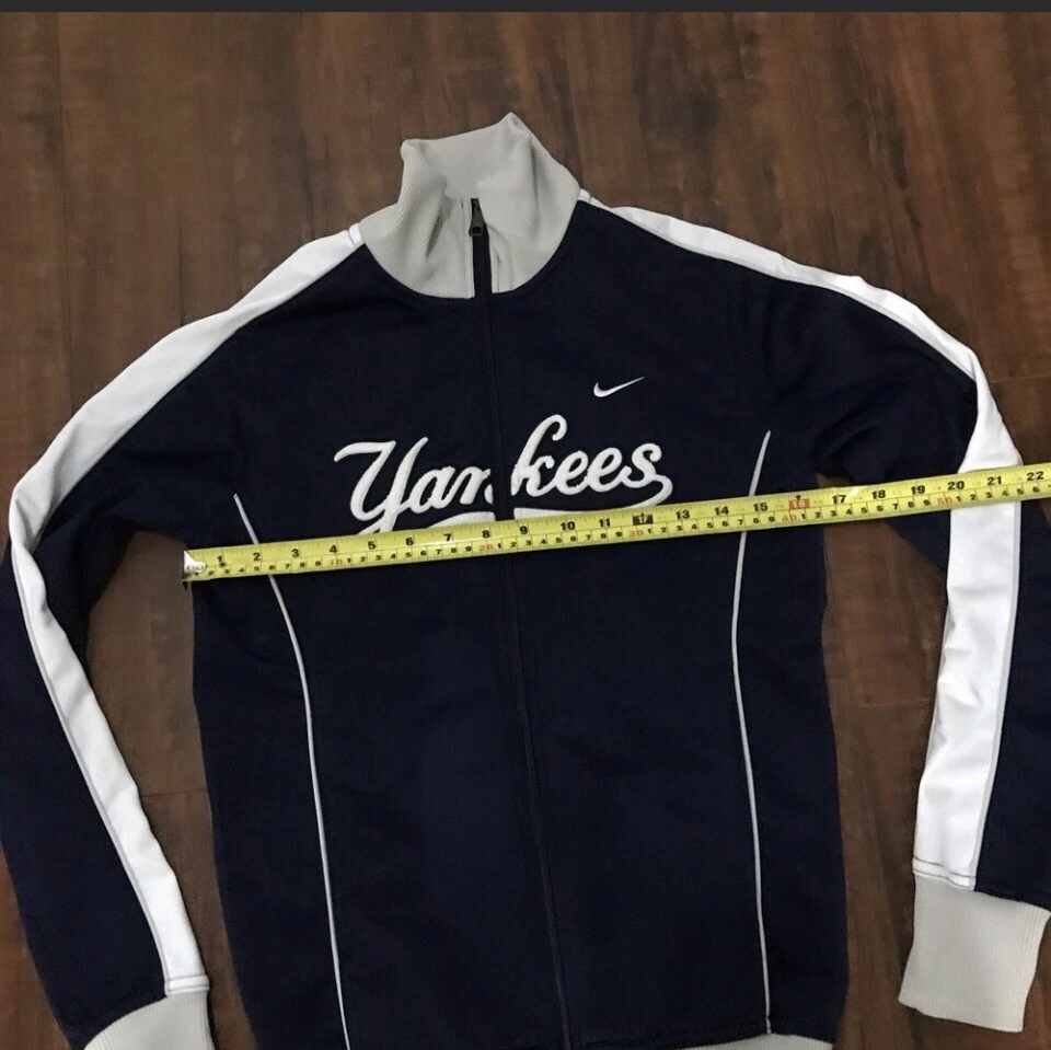 Size:SLeague:Major League (MLB)Color:Blue WhiteTeam:New York Yankeesgtin13:Does not applySport:Baseball-MLBGender:WomenCountry/Region of Manufacture:ChinaUPC:Does not applyProduct:JacketBrand:Nike
