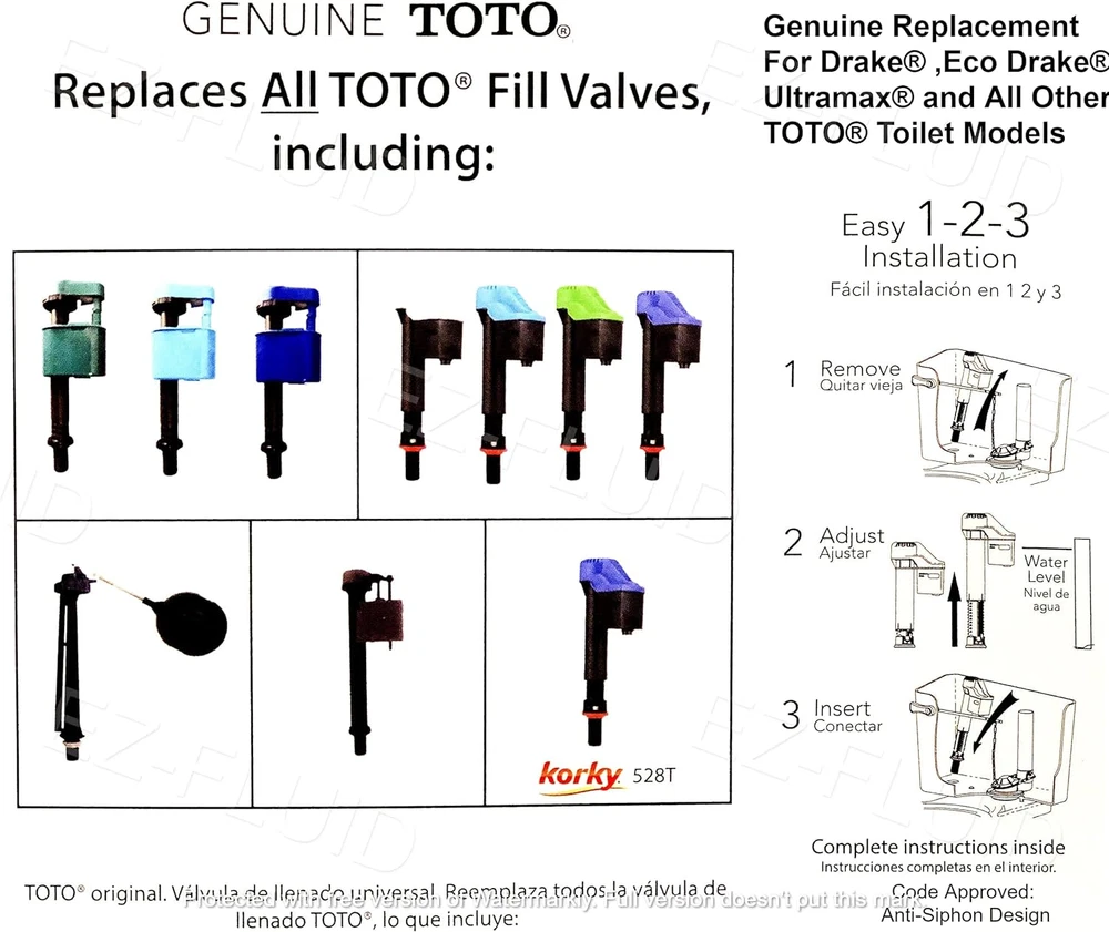 Store New Arrivals Add to Favorite View Feedback Contact Genuine TOTO USA Made Korky 528GT Blue Universal Toilet Fill Valve Assembly Kit Parts,Replace TSU99A.X and All Other TOTO Toilets (1) Description Valve Type Float Valve Item model number 528GT Item dimensions L x W x H 7 x 1 x 3 inches Inlet Connection Type Chlorinated Polyvinyl Chloride Item Package Quantity 1 Material Plastic Country of Origin USA Batteries Required? No Item Weight 9.1 ounces Number of Ports 1 Batteries Included? No Outlet Connection Type CPVC Exterior Finish Uncoated Plastic Product Dimensions 7 x 1 x 3 inches Manufacturer Plumbing Products Korky 582GT Genuine Toto Universal Toilet Fill Valve Toilet Fill Valve Kit Parts Compatible with TOTO TSU99A.X and all other TOTO Fill Valve The fill valve height adjusts from 8-1/2 inch to 14 inch Includes fill valve and hardware, 5 year warranty Replaces & fixes all TOTO Fill Valves, Fill valve adjusts from 8-1/2" to 14",Specific fit for TOTO Also replace TOTO #TSU18A,TSU36A,TSU09A,TSU36A,TSU17A,TSU30A,TSU31A,TSU13A and More Product Description About us EZ-Fluid Plumbing Products Inc. Supplies Premium Brass Tubular, Brass Ball Valves,Angle Stop Valves,Supply Connectors, Copper Fittings, and Press Fittings for Wholesalers, Hardware Stores, Contractors, and specialty builders. The company is based in the Bay Area, North California. ABOUT US We offer the best prices around on high quality products. Our E-store includes media such as books, movies, music and games while offering electronics, toys, sporting apparel, clothing, tools, general home, garden items and more. SHIPPING We are always working hard to ensure your package arrives as soon as possible. Please understand that some factors like weather, high postal traffic, and the performance of shipping companies are outside of our control. We offer free shipping to the lower 48 states and ship within 2 business days of payment, usually sooner. We do not accept P.O. Boxes. Please provide a physical address. For shipping outside of the continental USA, we only use eBay's Global Shipping Program.The item is shipped to KY and then sent to the rest of the world. International customers are responsible for all duties and taxes. Continue to check out in order to calculate costs for shipping the item to your country. Messages regarding eBay's Global Shipping Program MUST be directed at eBay EXCLUSIVELY. RETURNS We offer a 30-Day Return Policy on items which you are not completely satisfied with. You have the option for a full-refund or an exchange of the item. No returns are available on items shipped outside of the USA. PAYMENT We accept PayPal. CONTACT US This page content is yet to come Please ad us to your favorite seller and visit again later Thank You CUSTOMER SATISFACTION We try our very best to make sure every customer is completely satisfied. If there's a problem, message us! We're happy to help. WE ACCEPT Copyright © 2021 AutoDS. | All Rights Reserved
