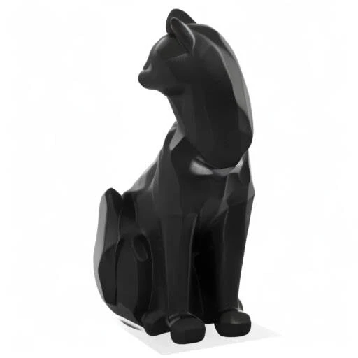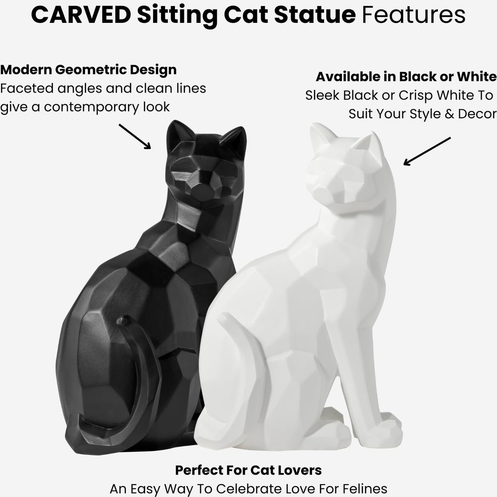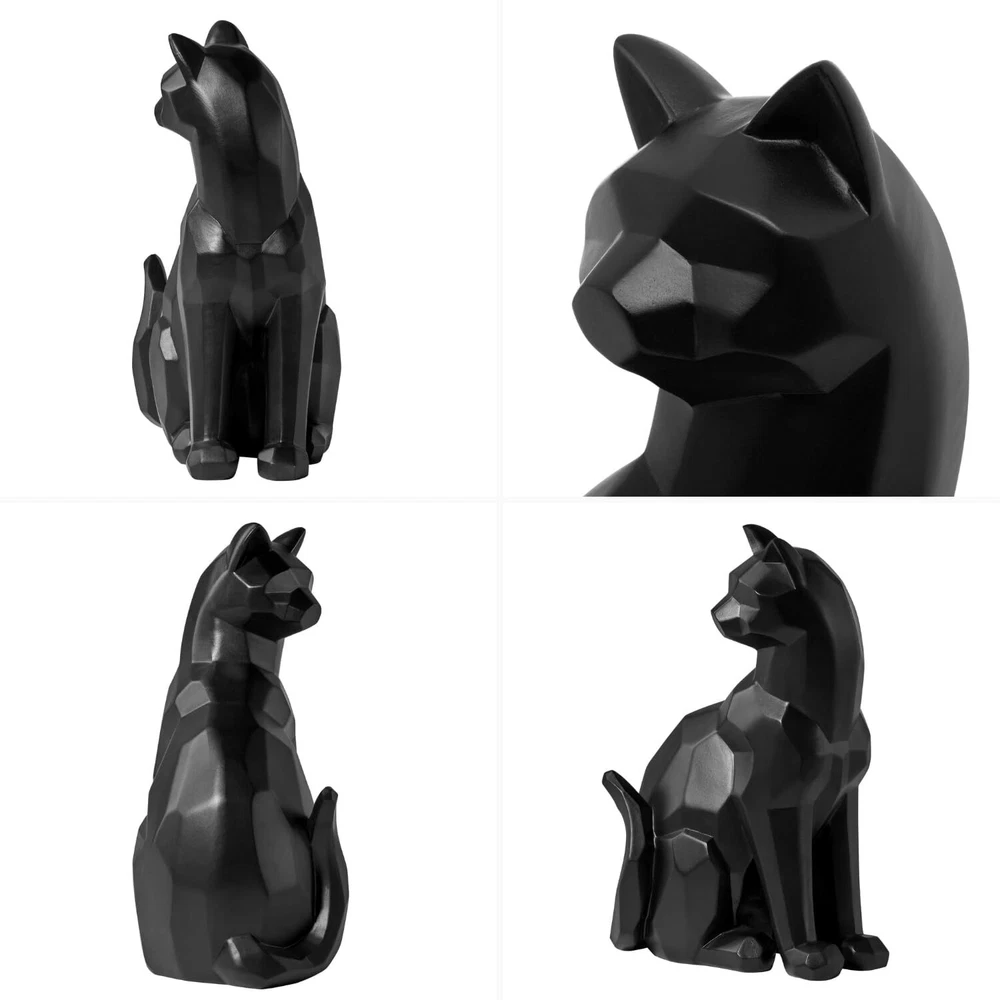 Black Carved Angle Sitting Cat- Our Carved Angle Collection, by , features a fusion of contemporary carved geometric shapes with charming cottage decor creating a spin on modern country. This series includes a rooster, horse, and cat, all available in both black and white. White cat measures 6.2 by 4.5 by 9.5 inches . specializes in sourcing the very best in clean, contemporary home decor and accessories from around the world. We create collections that reflect the newest trends in modern design and our style is synonymous with fresh, comfortable modern design in products that bring beauty to everyday living. Give your living space a lighthearted refresh with this geometric black cat figurine! With a modern, sleek design and a matte finish, this table-sized black cat sculpture can make itself at home regardless of your decorating style With its head turned to its back and a playful curve on its tail, this feline animal's whimsical posture radiates positive energy with a playful mood and friendly zen that we can all use in our spaces! This cute black cat decor will liven up your space whether it's placed in the living room, family room, bedroom, or kitchen! Sized to sit comfortably on a bookshelf, floating shelf, office desk, entryway console table, dresser, or windowsill! Give it some extra character by placing it around house plants, flower vases, table lamps, or other animal sculptures! Perfect Gift for Cat Lovers! This unique and charming midcentury themed décor will bring joy to your favorite friends and family members that love cats and house pets! Whether it's for a housewarming party, birthday, Christmas, or even in honor of losing a beloved cat or kitten, the abstract design of this house decor makes it a versatile accent for a variety of scenarios. This cat statue measures 6.25" W x 4.5"D x 9.5" H. Made by hand from high-quality resin with a semi-matte black finish