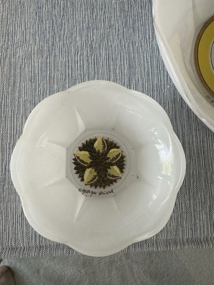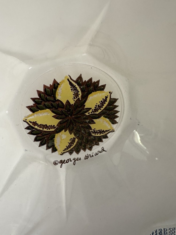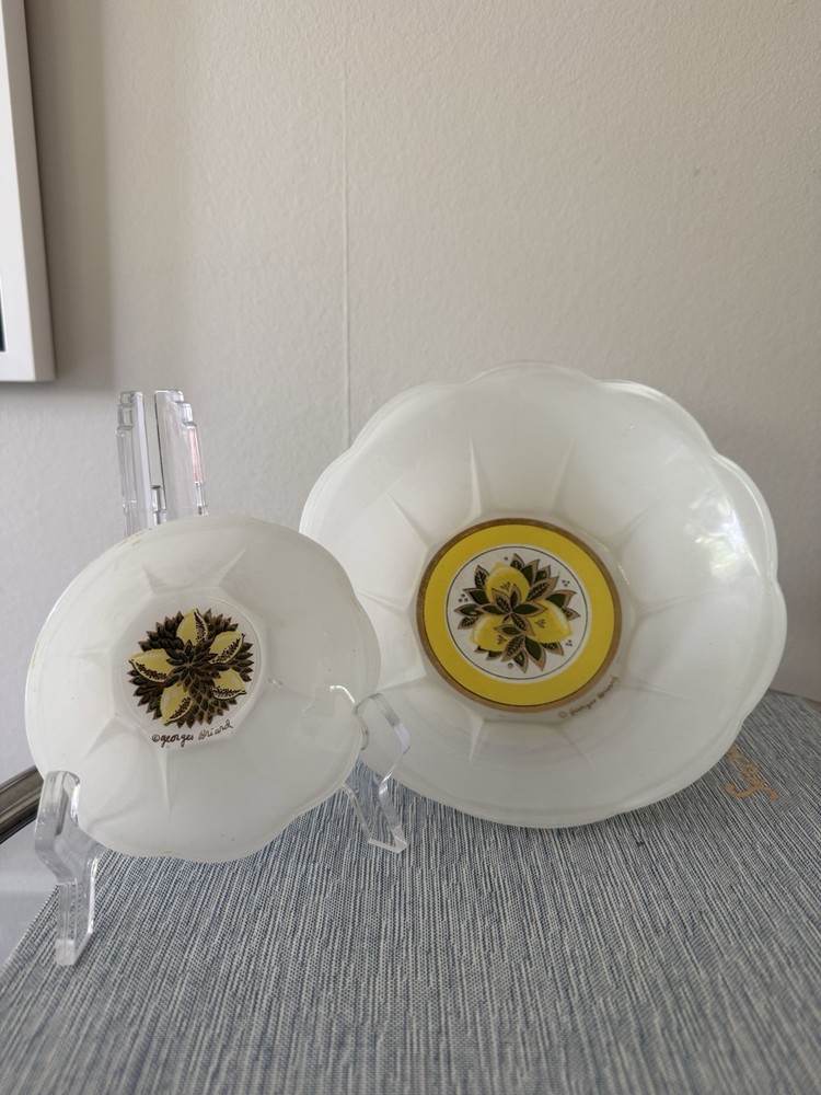 Georges Briard bowl chip and dip set. Mid Century Modern 2 piece Such a beautiful and rare find! Rare GEORGES BRIARD MCM glass LEMONS 2 piece CHIP & DIP scalloped Bowl set. No chips, but a few scratches in the white paint and a bit of wear in gold gilding. Pictures should reflect. The large bowl 8" Diameter 3" Height. The smaller bowl is 4" Diameter and 1.5" Height.