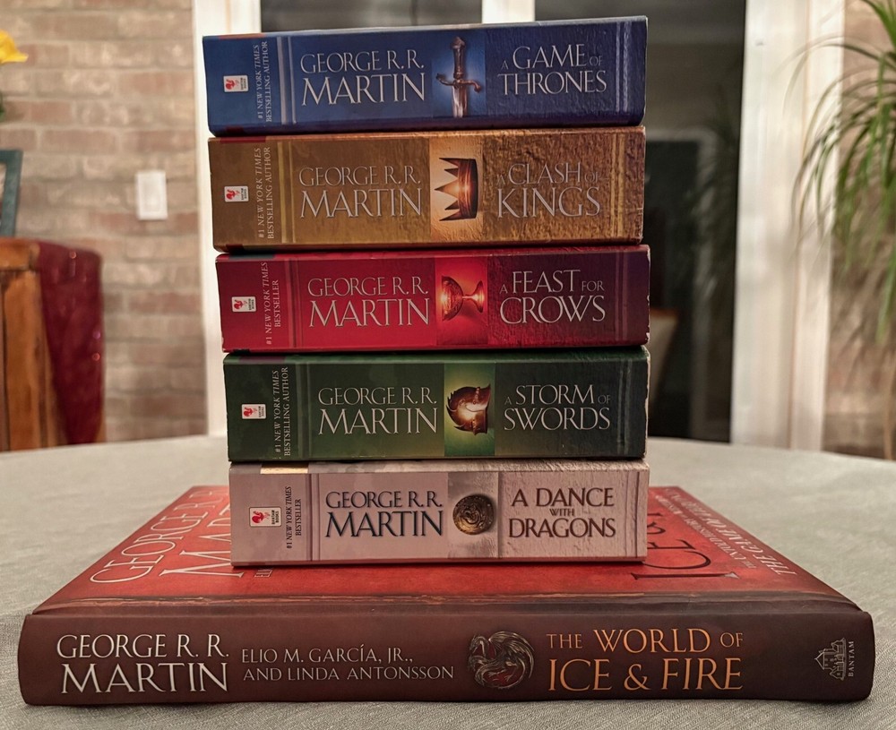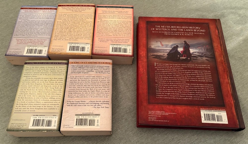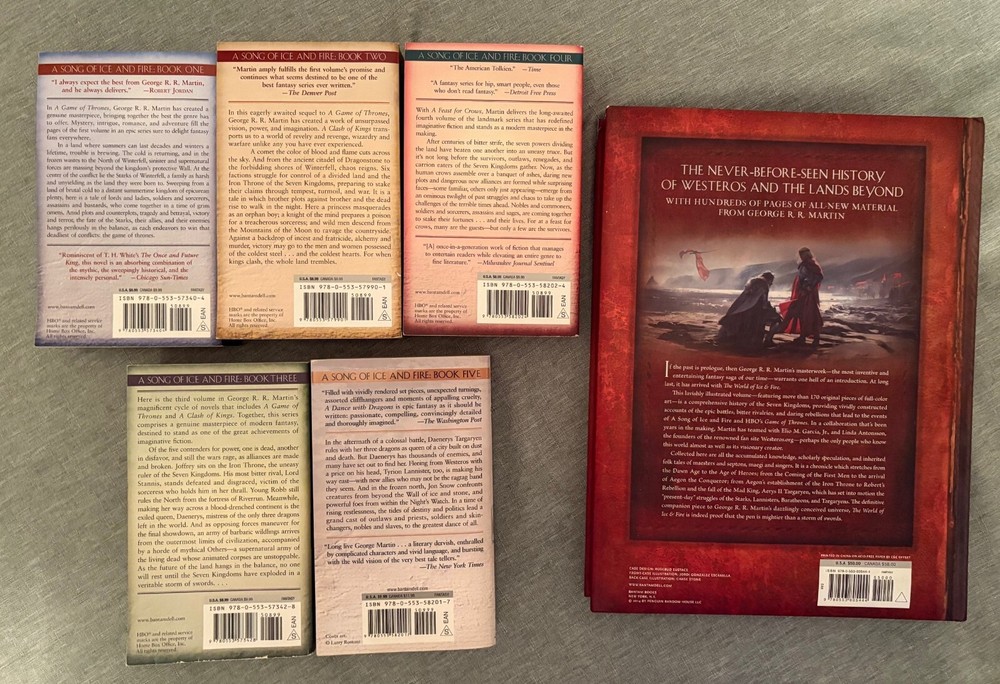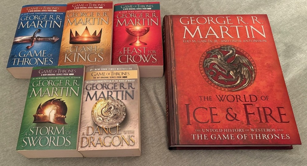 Here is a lot of the five large paperbacks written by George R.R. Martin that created the world of “The Game of Thrones.” Also included is a large, deluxe coffee-table book dedicated to the world that Martin has so successfully created. You get: Paperbacks: · A Game of Thrones (Bantam, 1996/2011) · A Clash of Kings (Bantam, 1999/2011) · A Storm of Swords (Bantam, 2000/2011) · A Feast for Crows (Bantam, 2005/2011) · A Dance with Dragons (Bantam, 2011/2013) Hardcover (large-sized): · The World of Ice and Fire: The Untold History of Westeros and The Game of Thrones (Bantam, 2014) Check out my other auctions (more vintage sci-fi, fantasy and horror paperbacks). For multiple wins, I can combine shipments and discount the overall shipping charge.
