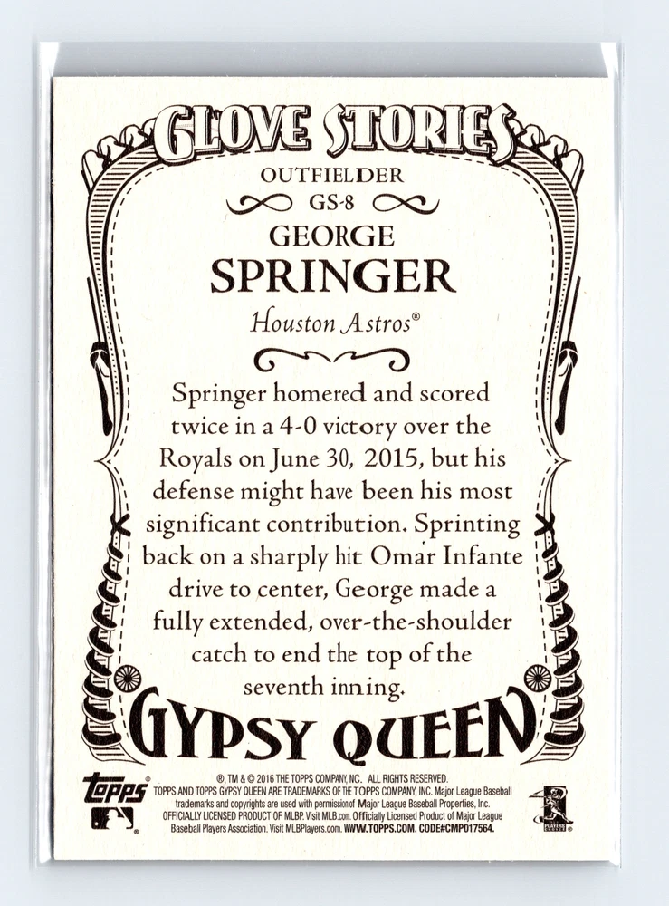 George Springer 2016 Topps Gypsy Queen Glove Stories Houston Astros #GS-8 Cards are ran through a scanner. Any lines shown are on the sleeve not the card. If you would like additional pictures just ask. Check out our store for more great deals! Thanks