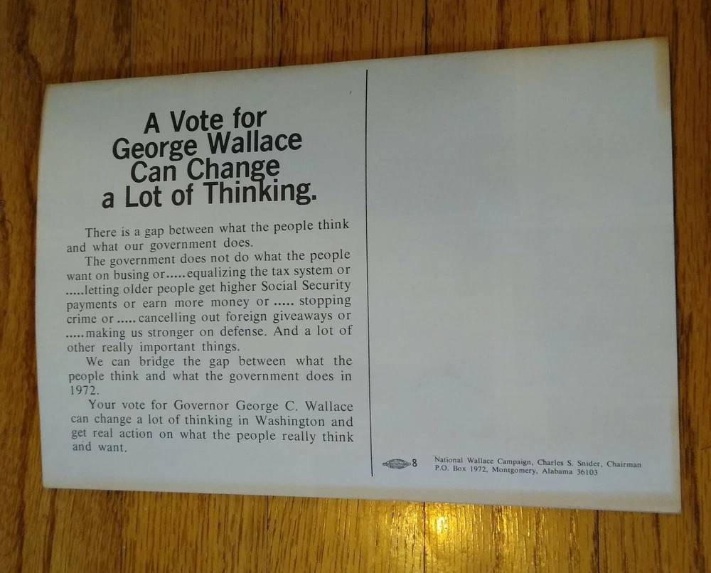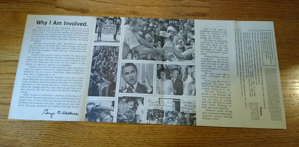 RARE 1972 George Wallace brochure---tear-off support coupon fully attached. Very Good Condition, no tears or rips----only slight yellowing on the edge from almost 50 years ago. Great photos inside, including homemade signs of support---be sure to enlarge the pictures! Want more than one? Discounts available! Ships USPS First Class Two sold, only two more available.