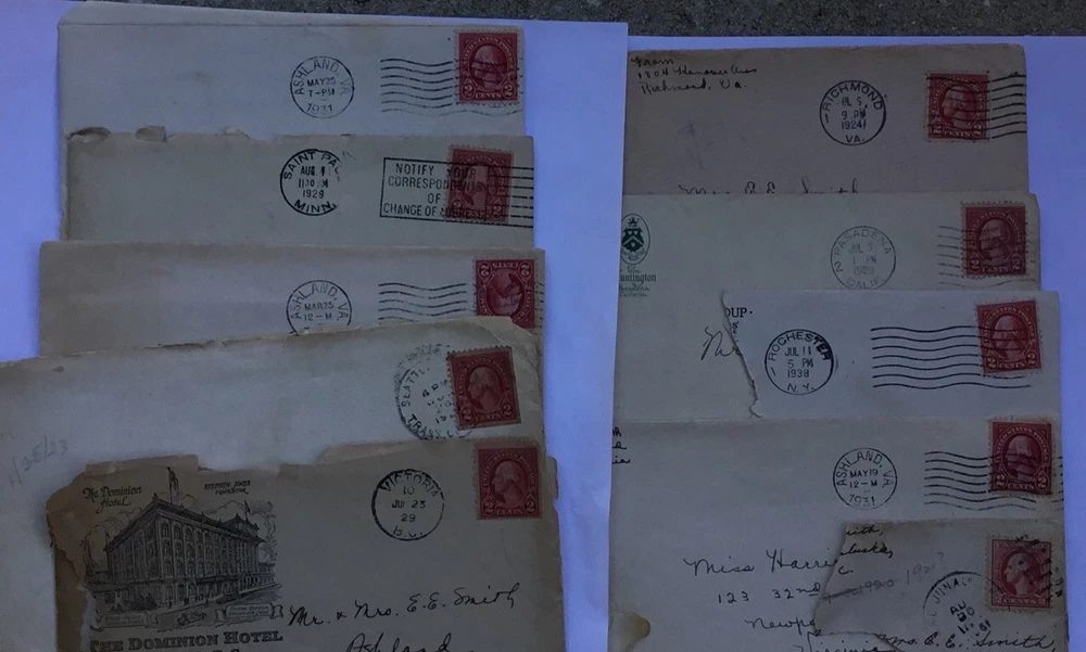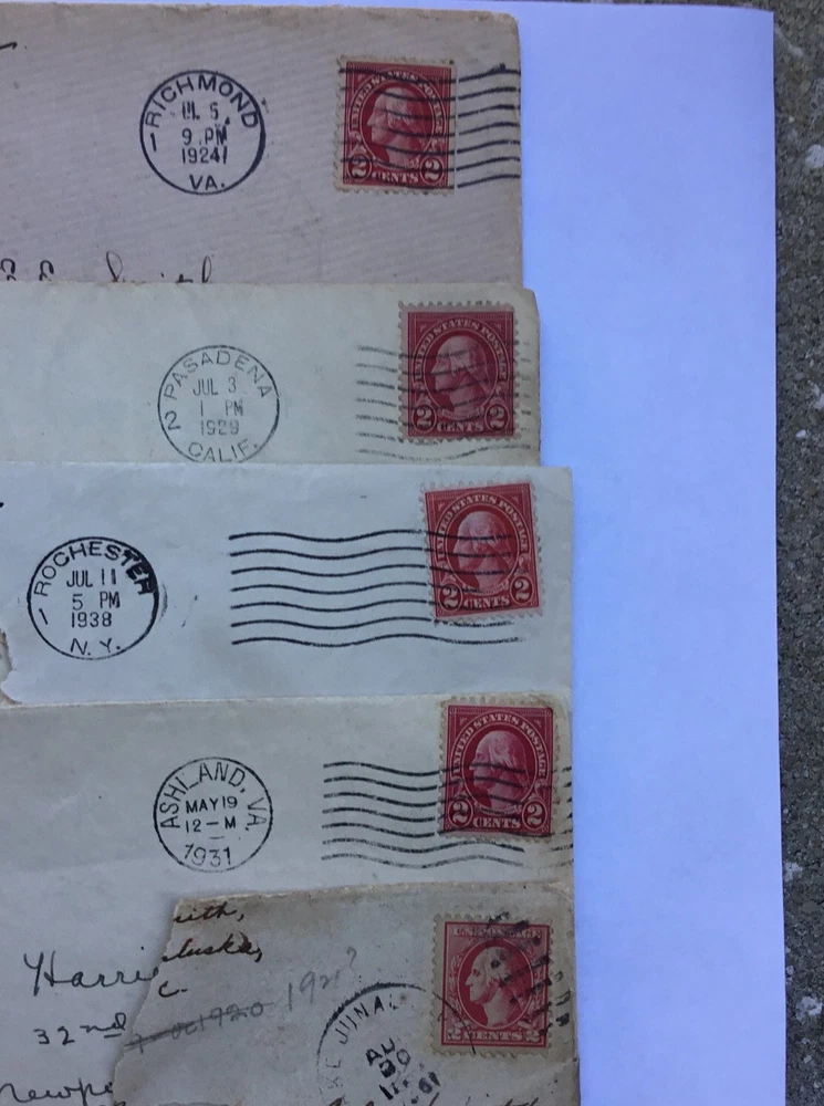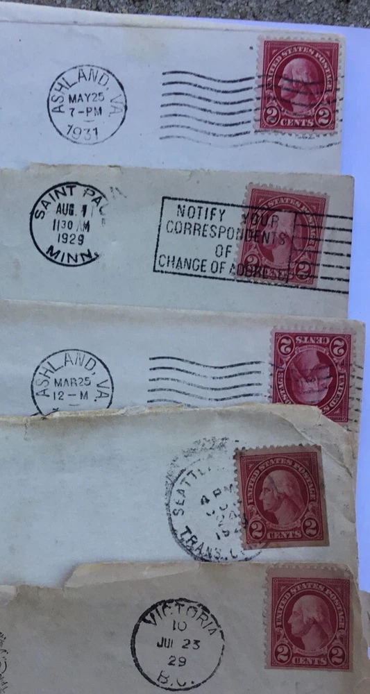 This lot of 10 George Washington Red Two 2 Cent Stamps on Envelopes will range from 1929-1938.