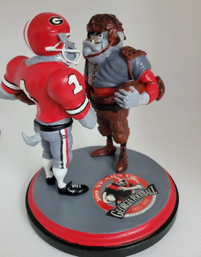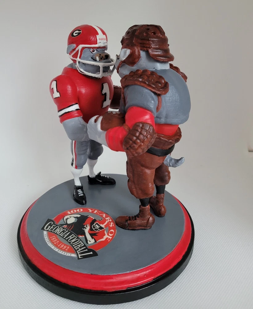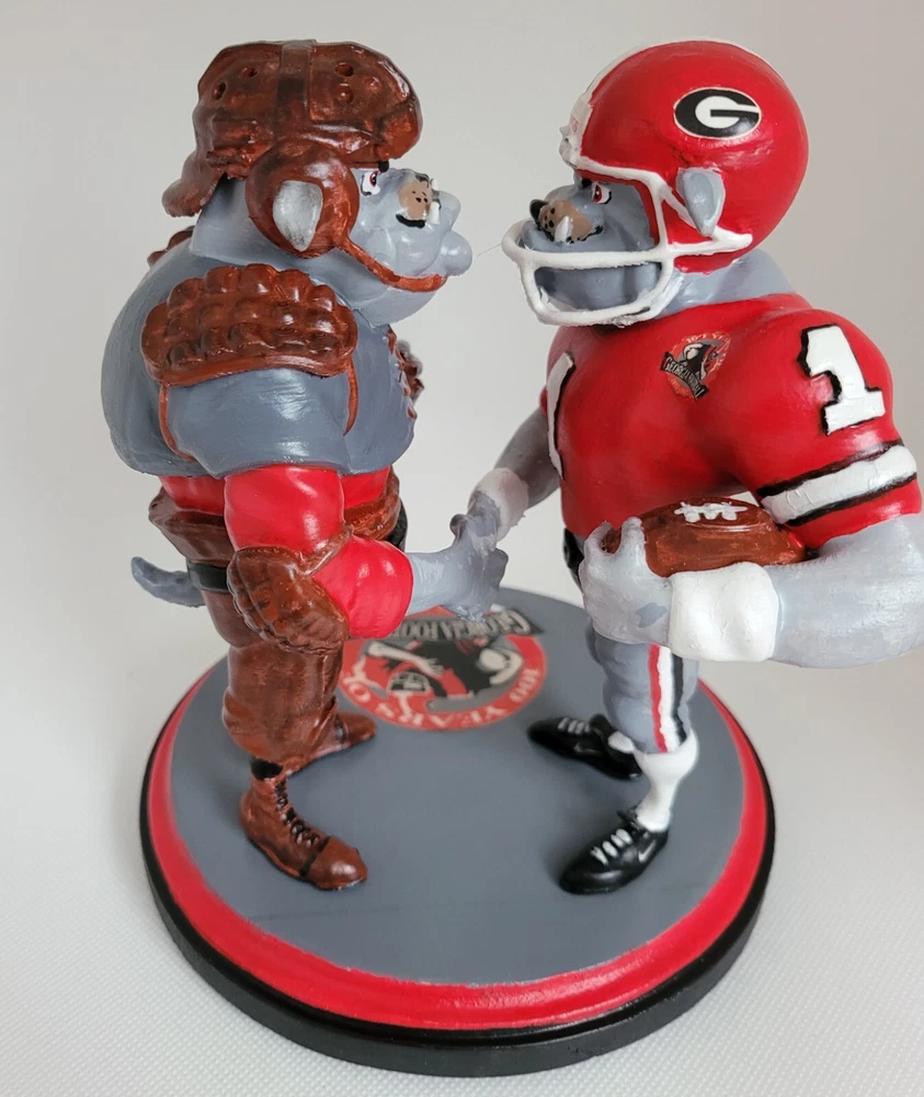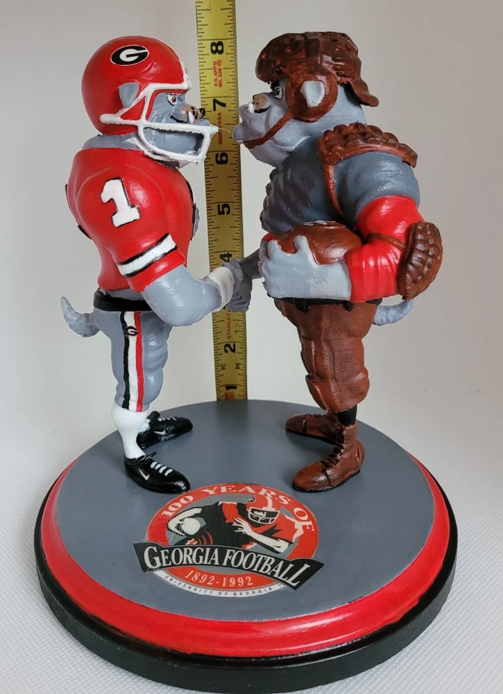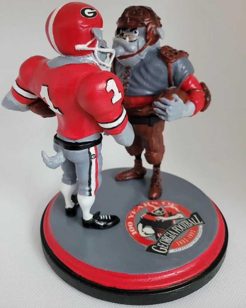 Up for auction is a custom hand crafted figurine. The figurine was 3D printed and then hand painted and sealed. The figurine was inspired by the artwork of Jack Davis celebrating the 100 years of Georgia Football. The figurine measures 6.5 inches high and 6 inches wide approximately and comes with a base This is the SMALL version of this figurine. There is a larger one available in our other auctions. The figurine will be shipped via UPS ground unless other shipping arrangements are requested. Good luck and as always if you have any questions or concerns, please feel free to contact us. We usually respond as quickly as possible. Thank you for looking at our auction. Go Dawgs!