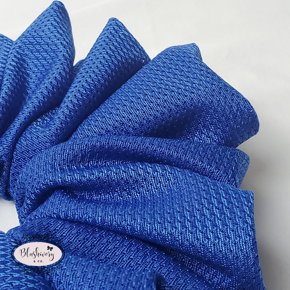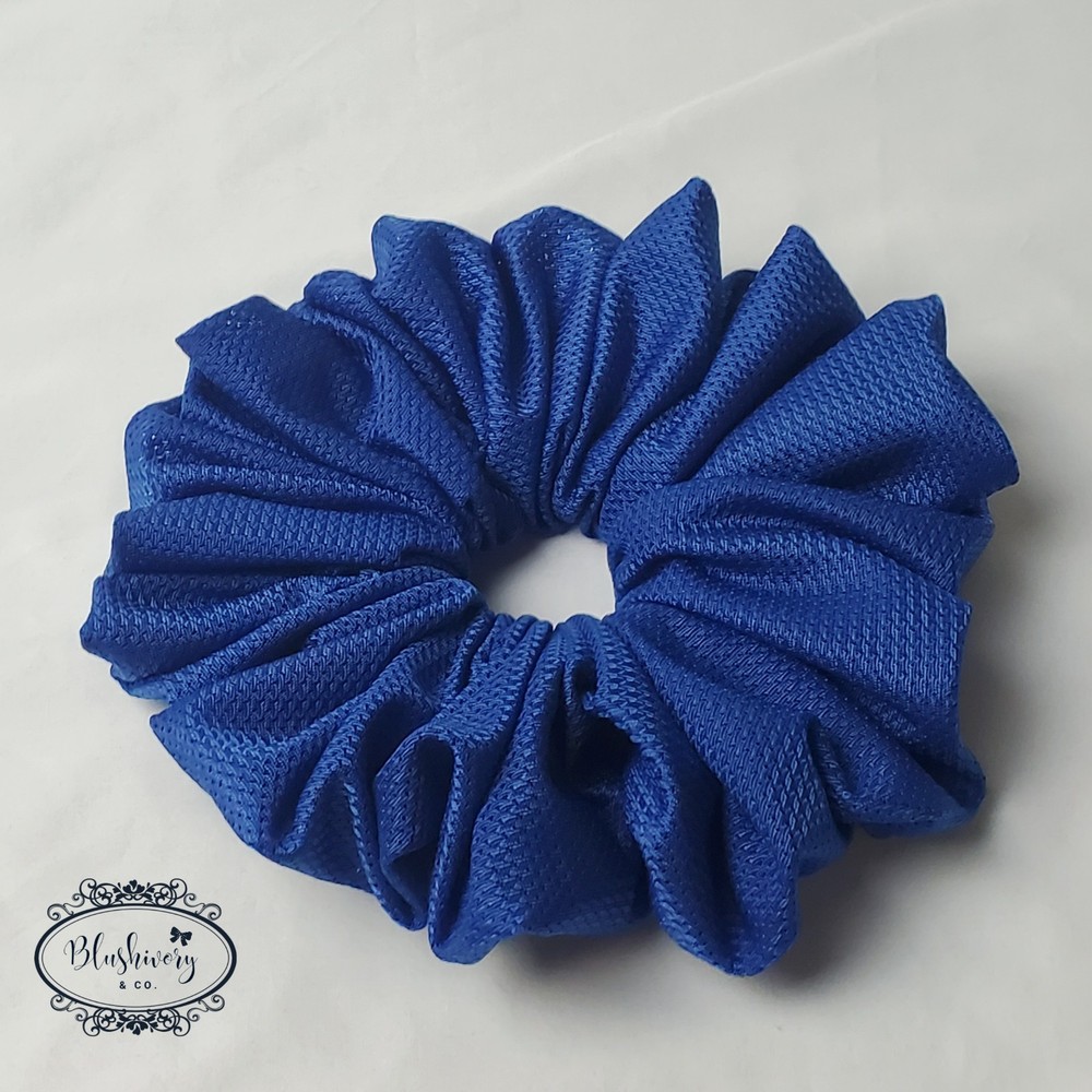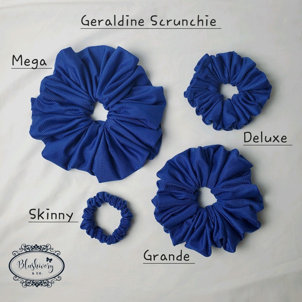 Geraldine Scrunchie -size: Mega (see photo for size comparison) -color/pattern: Blue, solid -Jersey, polyester/rayon. -Machine wash, cold. -New handmade. -Washington USA *Package include: 1pc. Geraldine Scrunchie, Grande size hair tie. ------------------- [scgrnd-jer-056]
