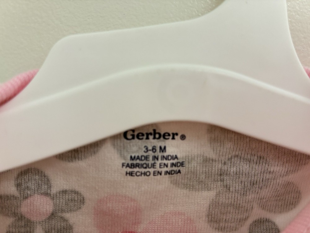 Sleeve Length: Short Sleeve Garment Care: Machine Washable Country of Origin: India Size: 3-6 Months Number of Pieces: 1 Piece Features: Comfort, Easy Care, Lightweight, Stretch Brand: Gerber Occasion: Casual Theme: Flower Style: Onesie Closure: Snap Type: One-Piece Pattern: Floral Department: Girls Color: White Material: 100% Cotton Seller Notes: “In very good condition. Free of rips or stains.” Season: Fall, Spring, Summer