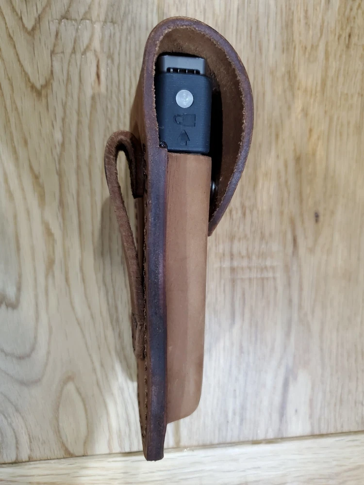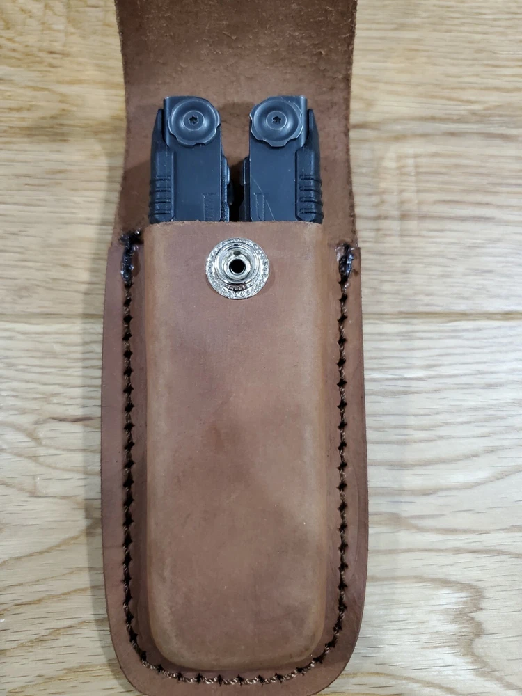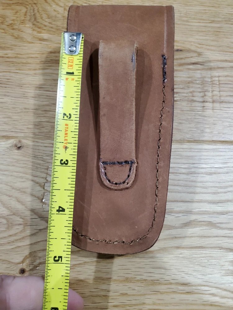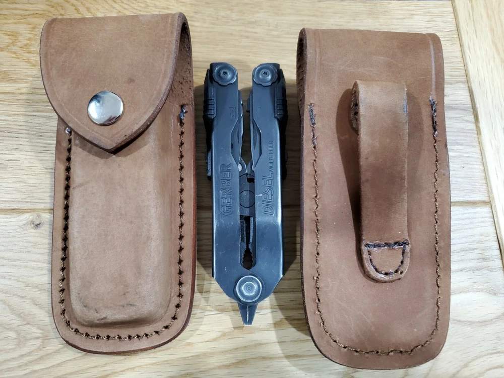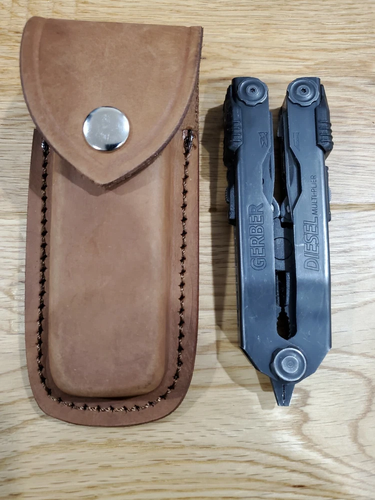 Gerber MP600 custom Distressed Brown leather sheath. Will also hold a Gerber Diesel as shown. Great fit. Listing is for 1 Brown sheath. Sheath only The sheath in photos is representative of the one you will receive. Will fit a belt up to 2 inches wide This is made for right or left draw. ************* Gerber in photos is for display only not included in listing. ********* ********* Any KNIFE or MULTI TOOL - LEATHERMAN used to display a sheath is not included as part of listing. The listing is for the sheath only. *************