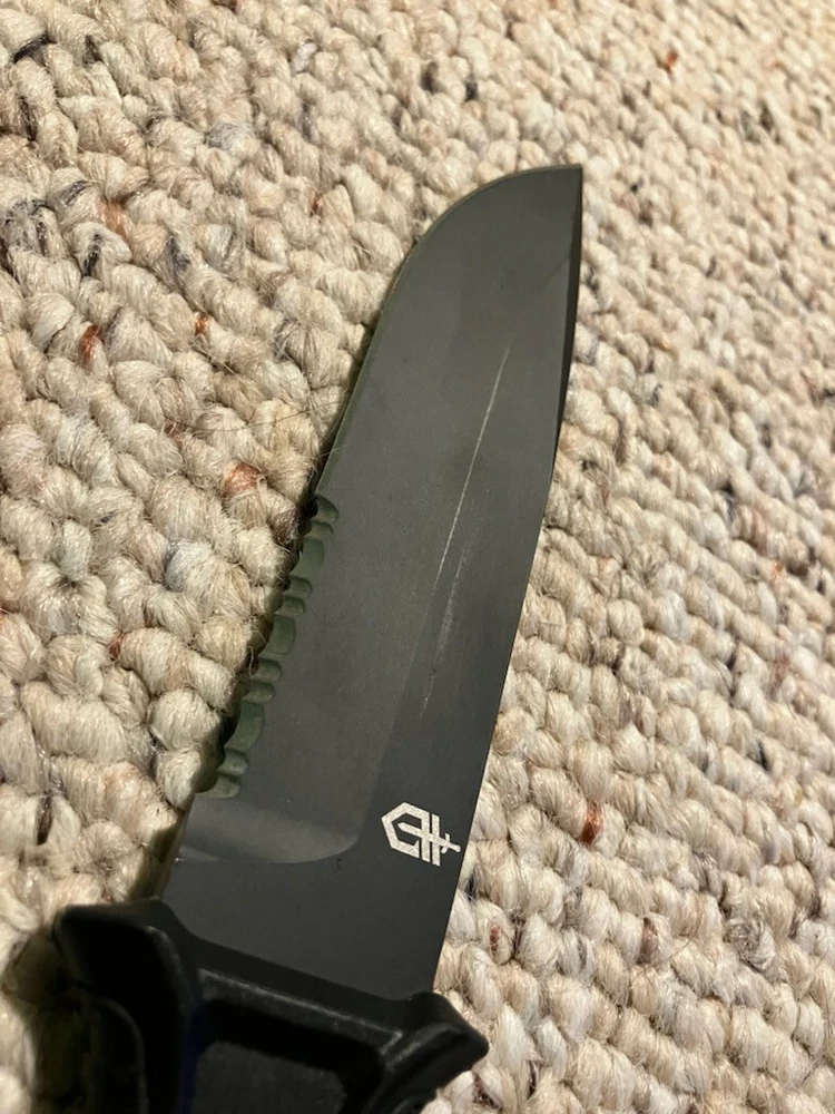 Gerber strongarm black serrated combat/utility knife. Lightly used, mostly just some finish wear from being taken out of the sheath. Edge in like new condition. Made in USA!