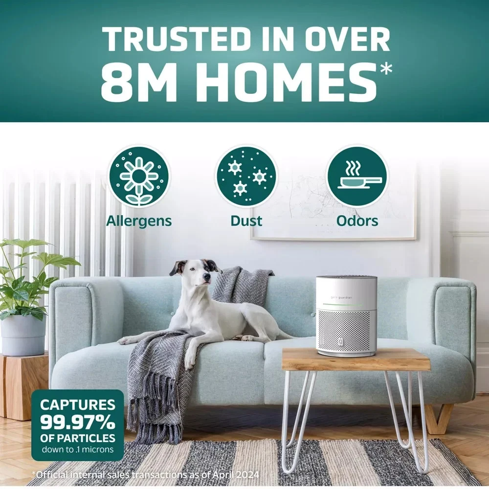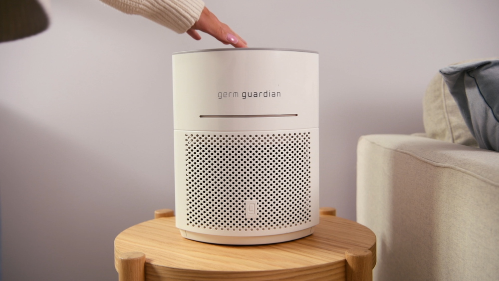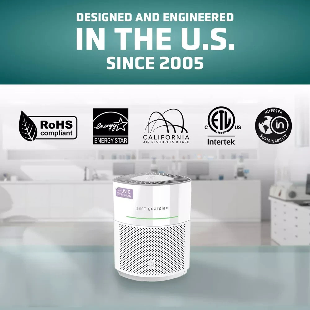 Highlights Guarding Your Air: Genuine high efficiency True 360 Degree HEPA air filter captures 99.97% of particles as small as 0.1 microns from all directions. Our True HEPA air filter traps dust, pollen, harmful germs, and pet dander* Germ-Reducing UV-C Technology: Ultraviolet - C (UV-C) light works with titanium dioxide to help reduce airborne germs, bacteria, and mold spores for cleaner, healthier air. Zero ozone certified for peace of mind** Intellisense Air Quality Indicator: Measures the room air quality 60 times per minute using a PM 2.5 sensor detecting tiny particles in the air smaller than the diameter of a strand of human hair. It automatically adjusts the speed when poor air is detected and returns to a lower speed after cleaning the dirty air Whole Room Coverage: An ideal air purifier for bedrooms and living spaces, this powerful home air purifier circulates and filters the air in medium (215 sq. ft.) rooms every 12.5 minutes or in a large (1043 sq. ft.) rooms every 60 minutes Reduces Odors: Activated carbon pre-filter traps dust, pet hair, and other large particles while extending the life of the HEPA filter. Treated carbon absorbs volatile organic compounds from the air and reduces odors from smoking, cooking, and pets Quiet Operation: 4 speed options with the lowest setting being utilized as gentle white noise for a quiet, restful night's sleep Genuine GermGuardian Filters: Replacement filter is HEPA Filter V (model numbers FLT151, FLT151PT, FLT151SM, FLT151VO). Carbon filters are available for an extra layer of protection (model FLT15CB4). The UV-C Replacement bulb is LB1000, off-brand filters may reduce efficacy, and may cause damage to the air purifier Performance Verified: *Initial efficiency value. As small as 0.1 microns from the air passing through the filter media. **Tested with Staphylococcus Albus, Escherichia Coli, Aspergillus, and Phi-X174 Description Elevate your home's atmosphere with the GermGuardian AC3000W AirSafe home air purifier for bedrooms, kitchens, offices, and more – It filters odors and trap allergens with 4 layers of protection. Immerse yourself in the tranquility of clean, allergen-free air as this powerful air purifier effortlessly captures and eliminates airborne particles. Equipped with a 360 Degree True HEPA Pure filter and optional UV-C light, this air purifier captures a remarkable 99.97% of dust, pollen, pet dander, and other allergens. Our testing proves it! Your at-home comfort can be customized with 4 speed settings, including an ultra-quiet mode on the lowest speed setting. This AirSafe purifier features an Intellisense air quality indicator, measuring the air quality 60 times per minute. It automatically adjusts the speed when poor air is detected, and can monitor air quality 24/7, always cleaning every second of the day. This air purifier circulates the air in a medium 215 sq. ft. room every 12.5 minutes or in a large 1043 sq. ft. room every hour, making it ideal for bedrooms, offices, basements, and other open concept spaces. Looking out for your family's well-being is no small feat. That's why we'll take the task of guarding your air to keep it clean and fresh. Let our meticulously engineered, rigorously tested and reliably proven products purify your home and shield your environment from the smoke in your air.
