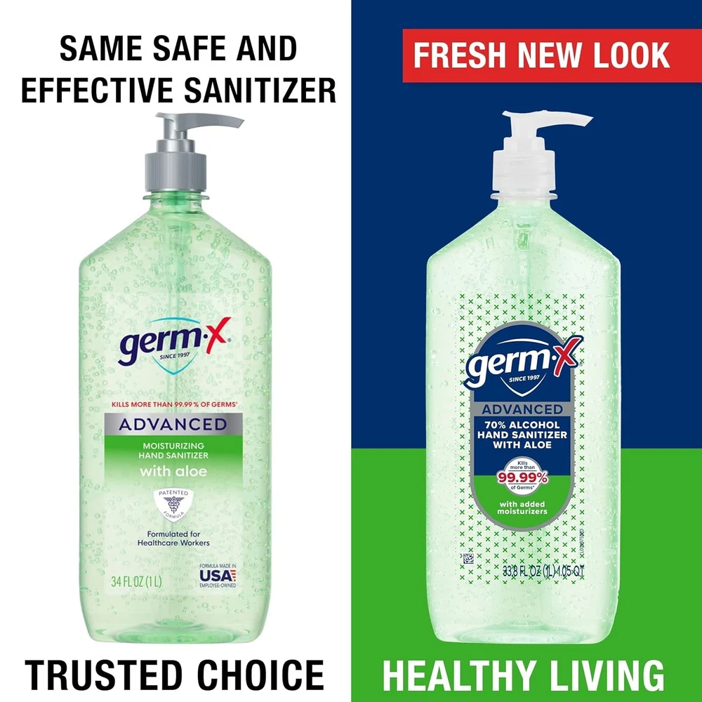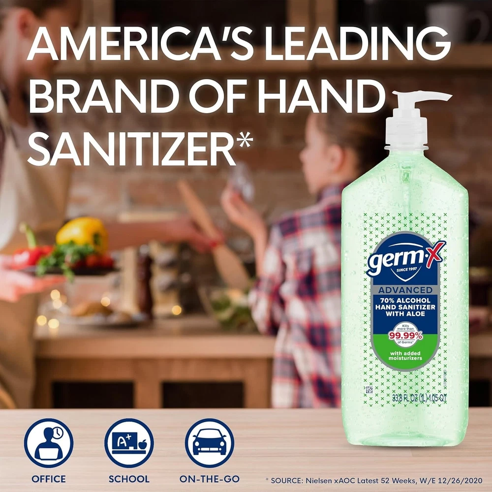 About this item Seasonal Change Essential: Help keep your family healthy this Fall with Germ-X hand sanitizer. When used as directed, our sanitizing products kill 99.99% of many common germs. Use at home, work, school or on the go Fast and Effective: Cleaning on the go just got a lot easier. Germ-X Advanced Aloe Hand Sanitizer gel kills 99.99% of germs without water in as little as 15 seconds Moisturizing Hand Sanitizer: This pleasant, fresh-smelling and non-drying sanitizing formula is enriched with Aloe and Vitamin E, leaving skin feeling soft and moisturized with no sticky residue Clear Gel Formula: This USP-grade alcohol-based liquid hand sanitizer is the perfect convenient alternative to soap and water to leave your hands feeling smooth and fresh X Germs with Confidence: We make Germ-X products that go wherever you go. From convenient pumps, flip-top caps, sprays, and even wipes, Germ-X products have you covered Manufactured In The USA: The makers of Germ-X products have been helping happy, healthy families since 1997
