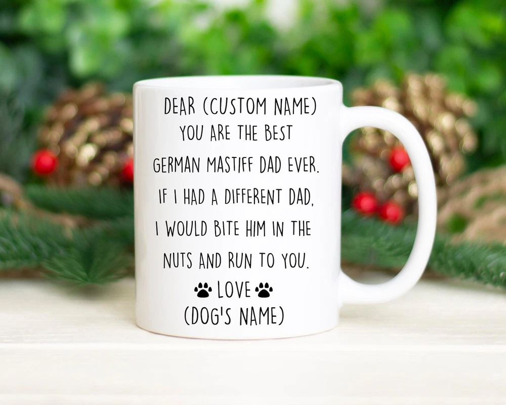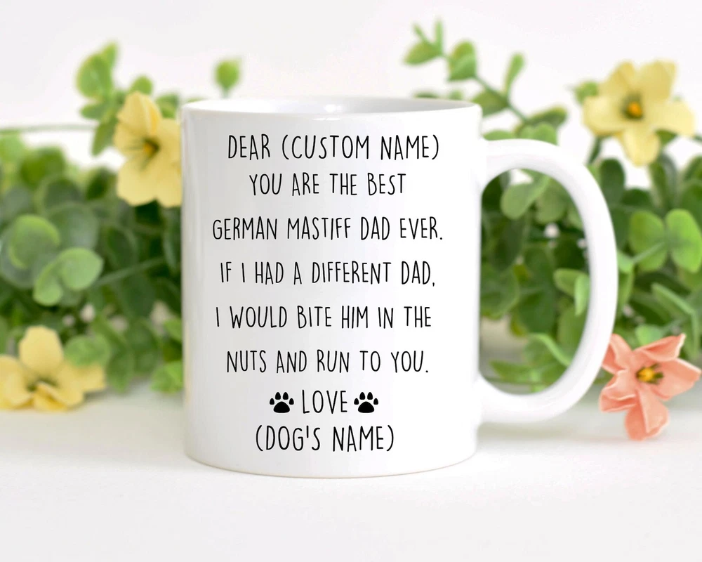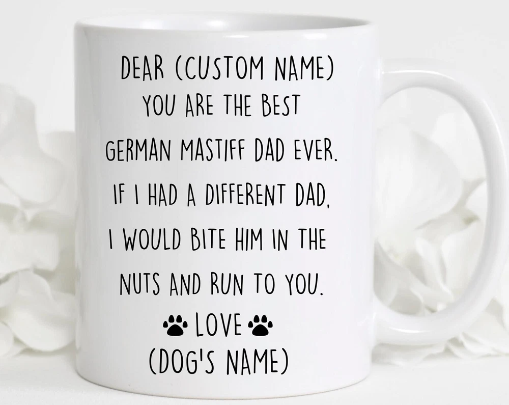 German Mastiff Dad Birthday Gift German Mastiff Dad Christmas Gift German Mastiff Dad Appreciation Great Dane Dad Gift Boarhound Dad Mug Product Details.. This high quality 11oz. ceramic white mug has a premium hard coat that provides crisp and vibrant color reproduction sure to last for years. Perfect for all hot & cold beverages. The highest quality printing possible is used. It will never fade no matter how many times you wash it. Material: 100% Ceramic. Print both sides. Dishwasher and Microwave Safe. High Gloss + Premium White Finish. Printed in the U.S.A. Personalized & Custom. We support personalized and custom mug to add custom, when placing an order, you can add notes to the "order note" in shipping address section. Also you can contact us directly via message. Shipping Info. Ready to ship in 1 to 2 business days, All products are made-to-order and proudly printed in the United States. Shipped by USPS and DHL, You will receive your order in 5-7 days. Replace & Refund. All products are defective during shipping broken, chipped will be replaced free of charge. You are not satisfied with the product, we will refund 100% money to you. If any other issues arise, please do not hesitate to message, we would be more than happy to assist you.