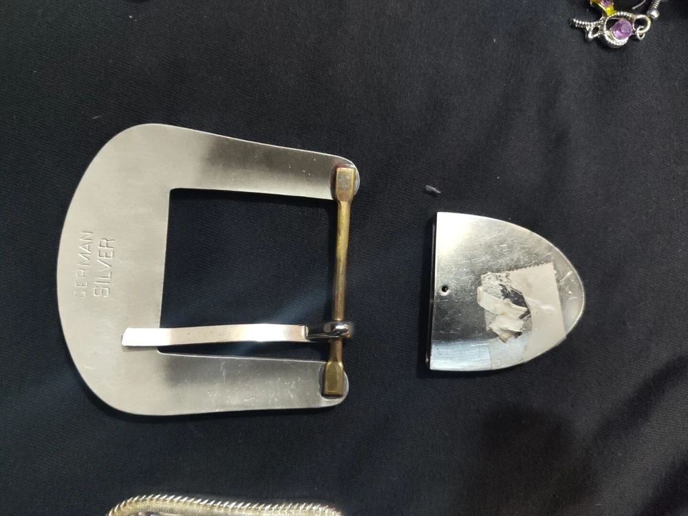 Add a touch of sophistication to your wardrobe with this German Silver Belt Buckle. Crafted with intricate details, this belt buckle is perfect for men who want to make a statement. The solid pattern and silver color make it a versatile accessory that can be paired with any outfit. This belt buckle is designed to complement any style and is perfect for those who want to add a touch of elegance to their look. It is suitable for any occasion and is made of high-quality materials that ensure durability. Upgrade your wardrobe with this German Silver Belt Buckle today!