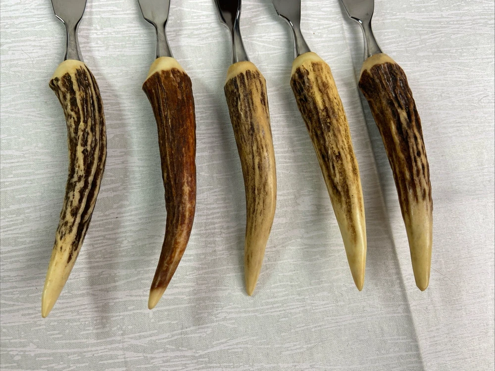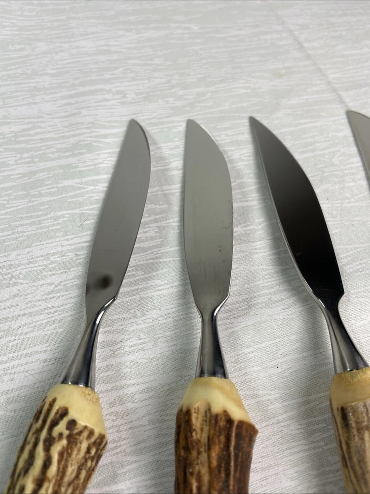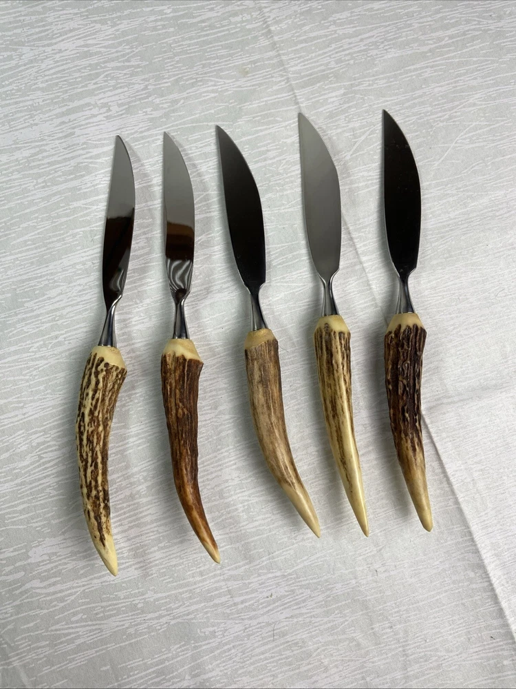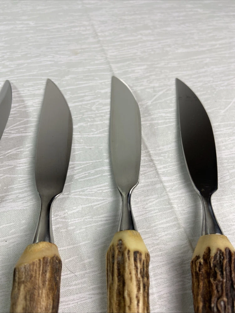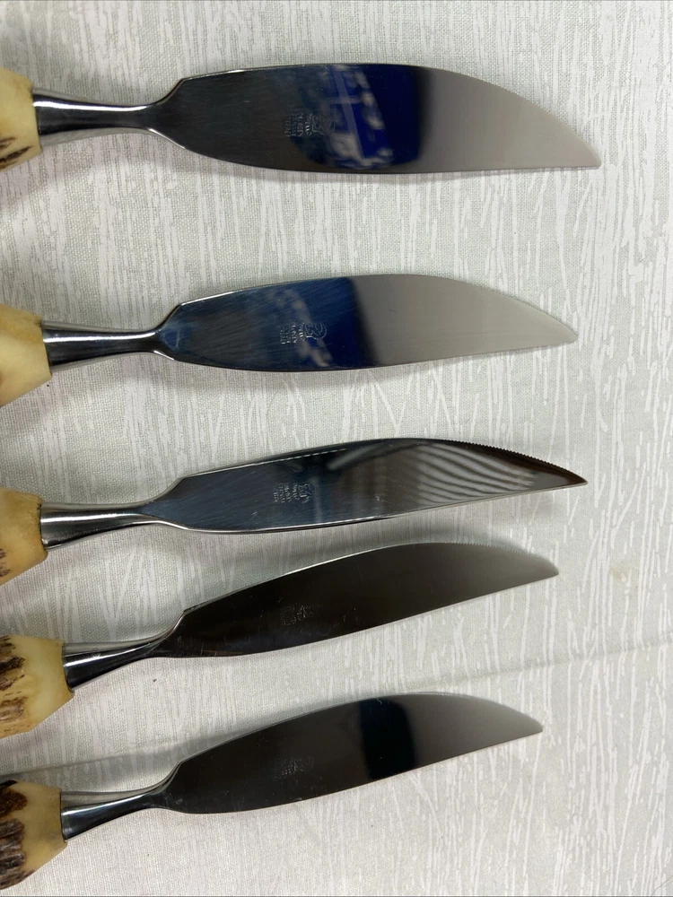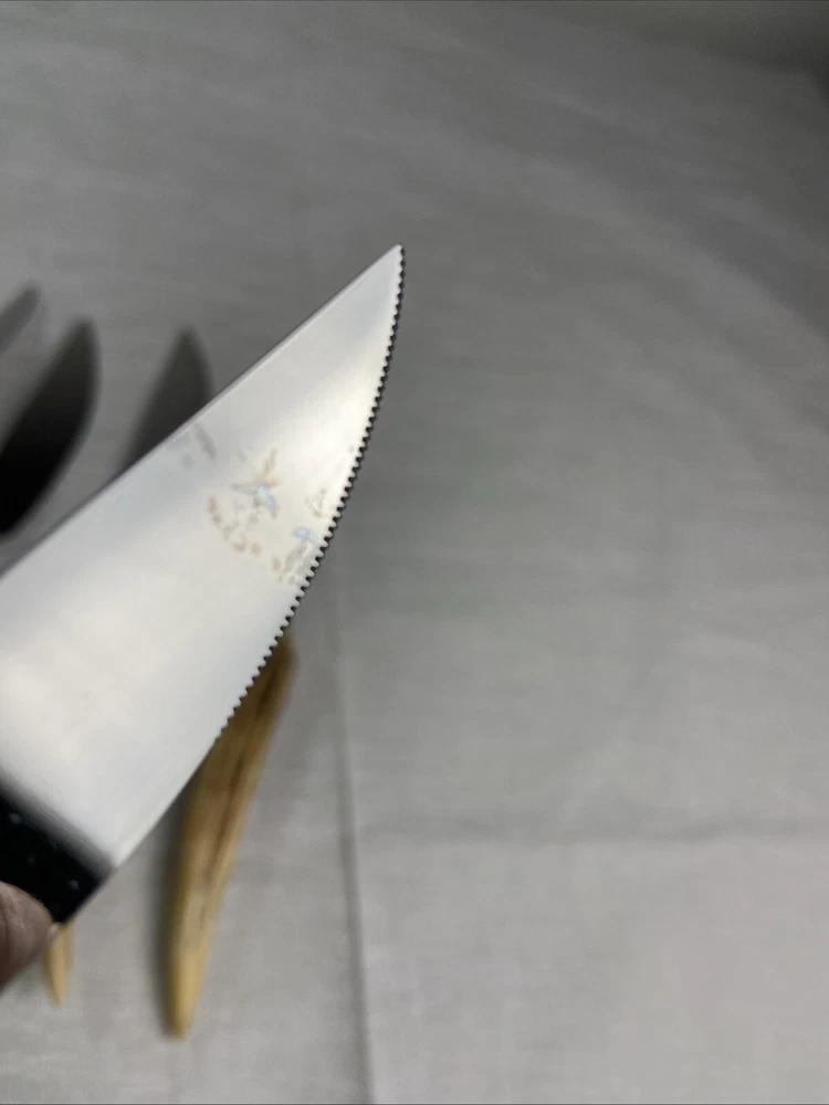 German Stag Antler Steak Knife Set Of 6Vintage Anton Wingen Jr Solingen Othello. Discoloration spot on end of one knife. See pictures for more details