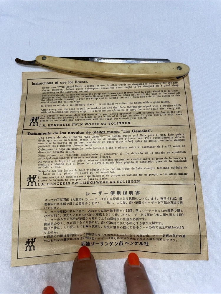 Antique straight razor from J A Hemckels No 401 in original box with instructions. The box is in tough shape as seen in the pictures. The razor has some obvious rusting and the blade is a little loose. Please look carefully at the pictures before bidding. If you have any questions please don’t hesitate to ask. I ship using USPS Ground Advantage within 2 business days of receiving payment. Thank you for looking 😊