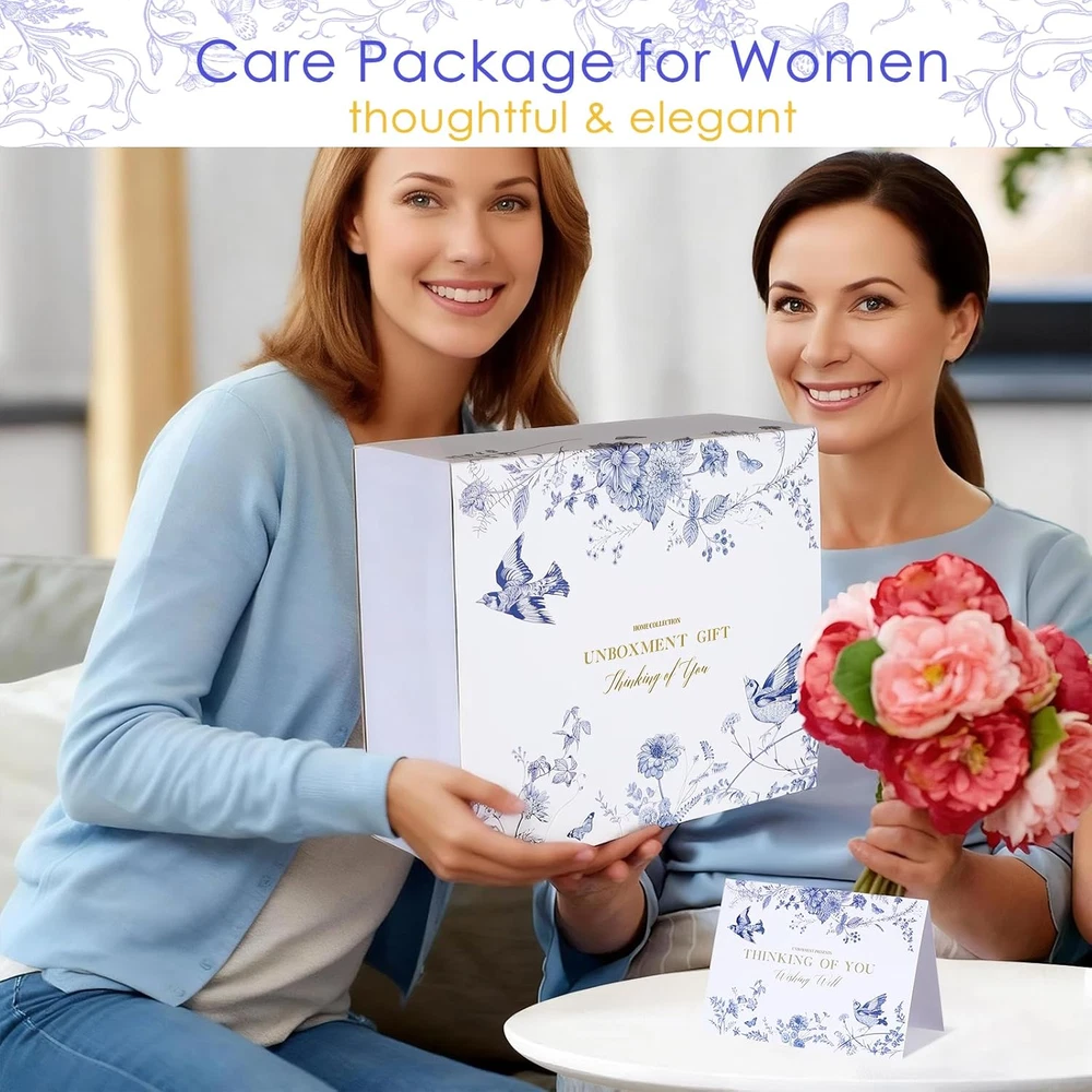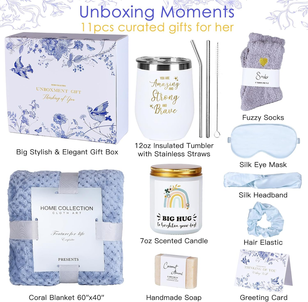 Store New Arrivals Add to Favorite View Feedback Contact Fast deliveries to the customer's home Quality customer service John Make the customers happy! Get Well Soon Gifts for Women, Self Care Package with Blanket, Spa Gift Basket for Sick Friends, Feel Better after Surgery Sympathy Thinking of You Description 14PCS Luxury Gifts Basket for Women: Blend of Comfort and Therapy. The Care Package for Women has been meticulously curated and handpacked with love. It includes a 12oz tumbler, a 7oz Scented Candle, a luxurious Coral Blanket, Cozy Fuzzy Socks, gold freesia Bath Bomb, handmade soap, a silk eye mask, headband, elastics, a greeting card. Take a moment to write your greetings on the card and send this self care package to provide healing & hug to someone who may be experiencing pain or hardship Unprecedented Unboxing Moments: Unlike other gifts that come in plain, unattractive packaging, our gift basket for women is double packaged in a sleek designer gift box. From the moment she lays eyes on the box, she'll know that she's in for something special. As she opens the box, she'll be greeted with a carefully curated selection of self-care products designed to help her relax, rejuvenate, and heal Deluxe Care Package for Women: Show your meticulous love and bring comfort to your loved ones, even when you're far away. Our Unboxment Get Well Soon Gifts for women, come with specially crafted, top-notch products that are sure to provide the desired care and support to the recipient. It's the perfect choice as get well soon gifts, thinking of you gifts, sympathy gifts, relaxing spa gifts, after surgery recovery gifts, and even for providing support, encouragement, and a source of comfort Insulated Tumbler 12oz: Crafted from premium food-grade stainless steel. With its double-walled vacuum insulation, it keeps your drinks at perfect temperature for up to 10H for cold and 5H for hot. Stylish and Portable, you can enjoy your coffee, tea, wine, juice, soda anywhere. It also says "You are amazing&strong&brave", expressing your support and care for someone who may need comfort, even if you're a million miles away. It's the perfect gift to encourage and uplift women in their journey Relaxing Spa Gifts for Her: Carefully packed with a perfect blend of delightful and indulgent treats. Inside, you will see a 7oz soy wax lavender scented candle to create a soothing ambiance, a handmade coconut almond soap for a pampering experience, a premium gold freesia bath bomb, and set of 3 premium silk eyemask, headband, hair elastic, to add a touch of luxury to your bath time Product description 1 Care Package for Women 2 Thoughtful and Graceful The New Gifting Experience Home Collection Curated Gifts The Complete Get Well Gift Set: Blend of Comfort and Therapy - The upgraded super soft light blue blanket, 60x40, ultimate warmth and comfort for her. Hospitals can often be cold and patients may experience chills due to medications. A warm blanket can help alleviate these symptoms, hug her warmly. Elegant Gifting Experience Say Goodbye to Tacky Gifts - Give the gift of elegance with our meticulously designed gift box. Inside, you'll find a selection of carefully curated gifts that are sure to make your recipient feel extraordinary. You'll also enjoy a hassle-free gifting experience with UNBOXMENT. Suitable for all kinds of occassions Self Gifts for Women / Care Package for Women Get Well Soon Gifts / After Surgery Gifts Thinking of You Gifts / Sympathy Gifts NOTE: PLEASE ADD YOUR PERSONALIZED MESSAGE BY CHECKING "This order contains a gift". Is this gift basket carefully packed? Everything is well packed and the gift box is double boxed that it comes in requires no further decorating. This is great for those who are not great at wrapping gifts or for those who do not have a lot of time curating a gift. What kind of occasion is this gift box suitable? Great gift to cheer someone up who is feeling down or grieving. Alternatively it makes for a very nice self care package. Everything was crafted beautifully and smells amazing. I am also looking for get well gifts for men, do you have mens gifts baskets? Yes, we also have Get Well Soon gifts basket for men, Care Package for Men. Swipe to See Other UNBOXMENT GIFTS - Handpacked with Care and Love Add to Cart Add to Cart Add to Cart Add to Cart Add to Cart Add to Cart Add to Cart Customer Reviews 4.8 out of 5 stars 117 4.8 out of 5 stars 7 4.7 out of 5 stars 96 4.8 out of 5 stars 87 4.6 out of 5 stars 87 4.7 out of 5 stars 238 4.7 out of 5 stars 238 Price $34.99 $ 34 . 99 $19.99 $ 19 . 99 $19.97 $ 19 . 97 $38.99 $ 38 . 99 $43.97 $ 43 . 97 $29.99 $ 29 . 99 $19.97 $ 19 . 97 BRAND UNBOXMENT UNBOXMENT UNBOXMENT UNBOXMENT UNBOXMENT UNBOXMENT UNBOXMENT GIFT BOX ✔ ✔ ✔ ✔ ✔ ✔ ✔ GREETING CARD ✔ ✔ ✔ ✔ ✔ ✔ ✔ TUMBLER MUG ✔ ✔ ✔ ✔ ✘ ✔ ✔ COZY BLANKET ✔ ✔ ✘ ✔ ✔ ✘ ✘ SCENT Lavender Orange Blossom Orange Blossom Sandalwood / / / OCCASIONS Sending hugs who needs care All Sending hugs who needs care Sending hugs who needs care Sending hugs who needs care Dad's Birthday, Father's Day Dad's Birthday, Father's Day Item model number UBX06 Style Get Well Care Package Capacity 12 ounces Number of Items 12 Pattern Solid Embellishment Glitter Theme Floral Unit Count 14 Count Product Dimensions 3.5"W x 4.5"H Material Stainless Steel Age Range (Description) Adult Finish Type Matte Specific Uses For Product Cold Drinks Included Components Straw Reusability Reusable Item Weight 4.22 pounds Material Feature Insulated Material Type Free Free from Fragile or Sensitive Materials Special Feature care package for women, get wel soon gifts for women, relaxing spa gifts for her Color Get Well Care Package Global Trade Identification Number 06975634290278 Shape Round Recommended Uses For Product Home Product Care Instructions Dishwasher Safe Size Large ABOUT US We offer the best prices around on high quality products. Our E-store includes media such as books, 