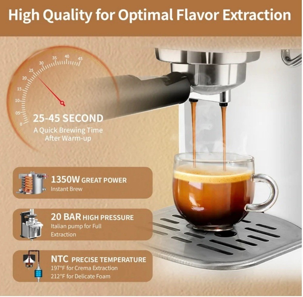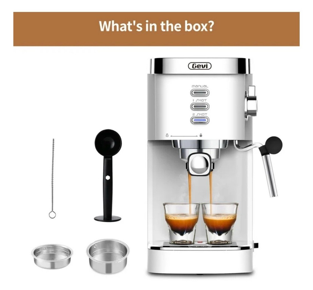 levate your coffee experience with the Gevi 20 Bar Automatic Espresso Machine. Featuring a powerful 1350W Thermoblock heating system, this machine can brew espresso or froth milk in just 45 seconds. Customize your drinks with the 3 cup size options, and enjoy the convenience of the 40.58 oz water tank and the stability of the 360-degree rotating milk frother wand. Crafted with a sleek white plastic design, this espresso machine delivers professional-grade coffee shop quality in the comfort of your own home. Enjoy a professional-grade coffee shop experience at home with the Gevi 20 Bar Automatic 40-Cup White Espresso Machine. Featuring a powerful 20 Bar high-pressure pump, this machine delivers fast and stable extraction, resulting in rich, flavorful espresso with a thick crema. The advanced 1350W Thermoblock Fast Heating System allows you to brew espresso or froth milk in just 45 seconds, ensuring your drinks are always hot and ready to enjoy. Customize your coffee with the three cup size options, allowing you to manually control the amount of espresso to suit your preferences. The 40.58 oz / 1.2 L water tank capacity provides ample capacity for multiple servings, while the 360-degree rotating milk frother wand ensures stable and consistent milk frothing. Crafted with a sleek white design, this espresso machine weighs 7.28 lbs and measures 12.2 x 6.1 x 12.2 inches, making it a compact and stylish addition to your kitchen. Powered by a 1350W wattage and equipped with a 20 Bar Italian ODM Pump pressure system, this espresso machine delivers professional-quality results every time. The package includes the Gevi ECME0-WH0A2 Espresso Machine with Milk Frother, a 1.5L oz Removable Water Tank, a 51 mm Portafilter, a 1 shot funnel, and a 2 shot funnel.