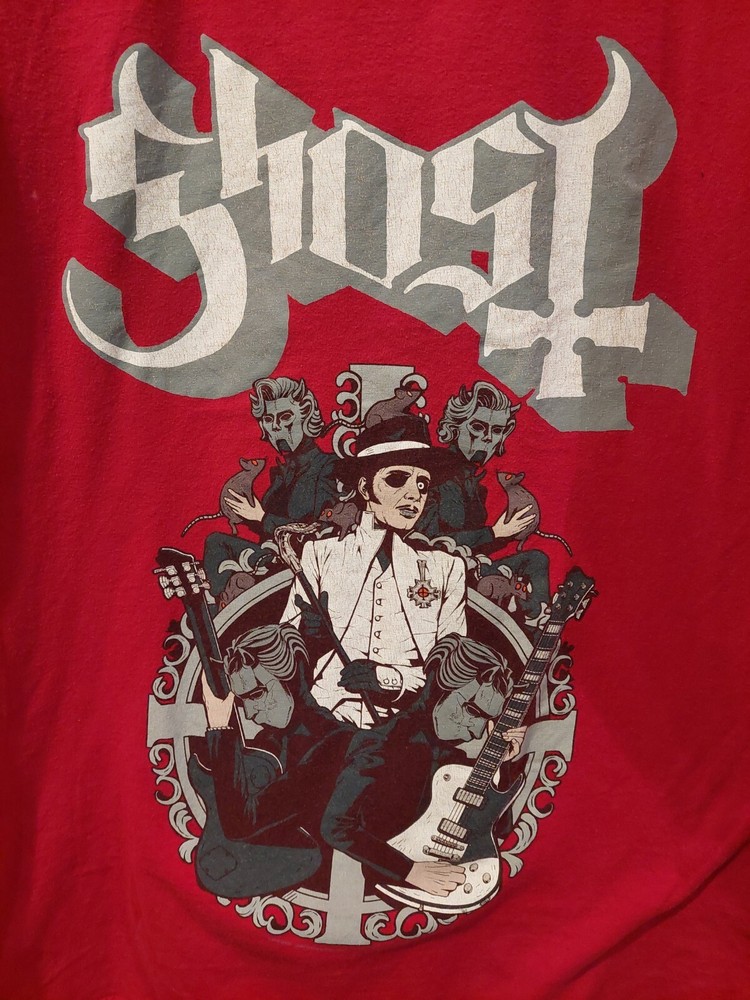 Ghost Band Cardinal Copia Papa T-Shirt Red Size XL This Ghost Band Cardinal Copia Papa T-Shirt is a must-have for any metal fan. Featuring the iconic imagery of Cardinal Copia from the famous Swedish metal band Ghost , this bold red shirt shows off the band's unique style. Please note there is some fading from wear, adding to its vintage appeal. Size : XL Condition : Gently used with some fading (see photos) Color : Red (with faded areas due to wear) Design : Cardinal Copia and Papa graphic Material : High-quality fabric for comfort and durability Perfect for : Fans of Ghost, metal music, or unique band merchandise Whether you're attending a concert or just want to show your love for Ghost, this shirt makes a standout statement. Don’t miss out on this piece for your collection!