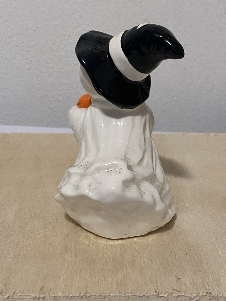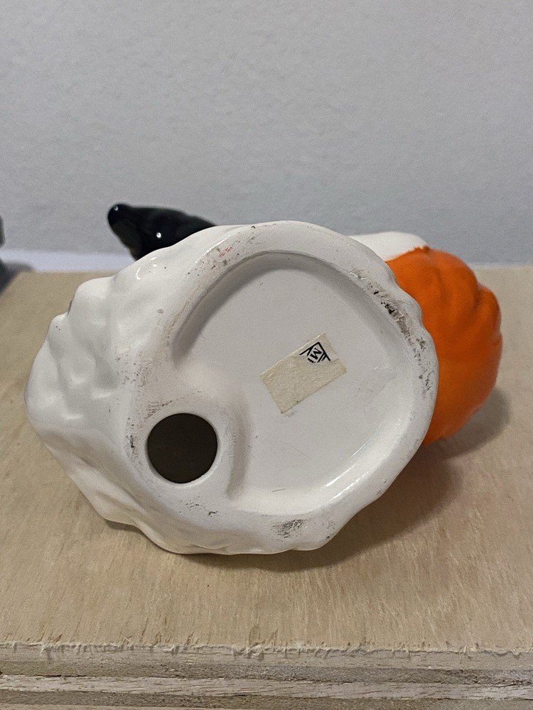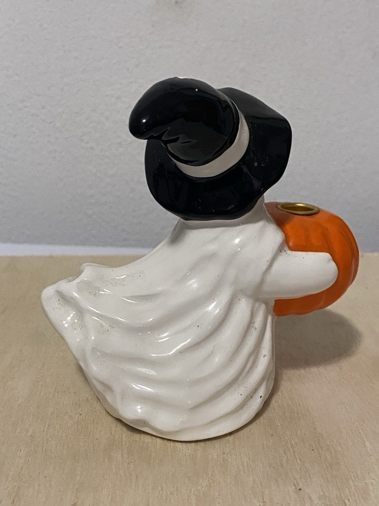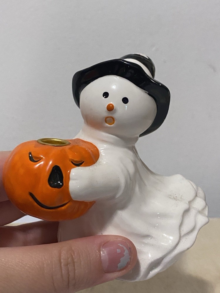 The Ghost Holding A Pumpkin Candle Holder Halloween Decoration Ceramic Figurine is a unique and whimsical addition to your Halloween decor. This multicolor ceramic figurine features a ghost holding a pumpkin, perfect for adding a spooky touch to your seasonal display. Created in the late 20th century, this original piece is a part of a Halloween collection, making it a special and authentic addition to your home decor. This figurine is designed for adults and is sure to delight and entertain during the Halloween season.