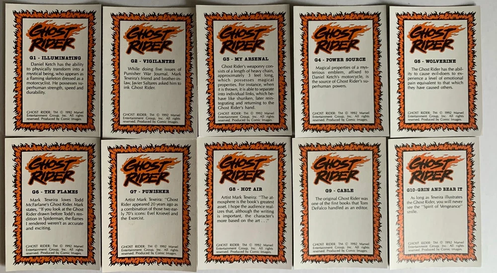 Description: Ghost Rider Series 2 Glow in the Dark Chase Card Set Contents: 10 Glow in the Dark chase cards, G1 through G10. Manufacturer: Comic Images, 1992. Condition: Near Mint.