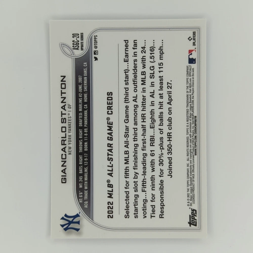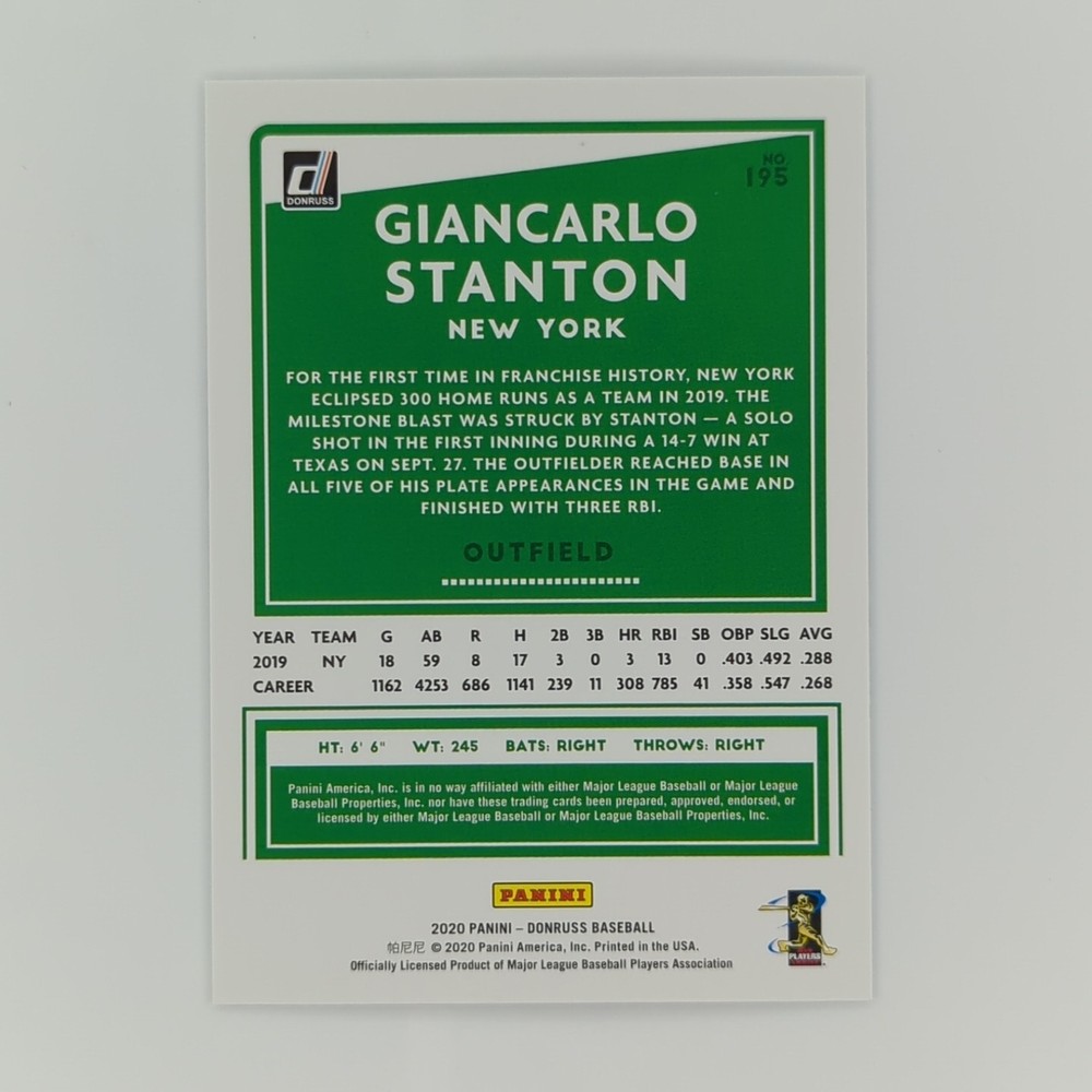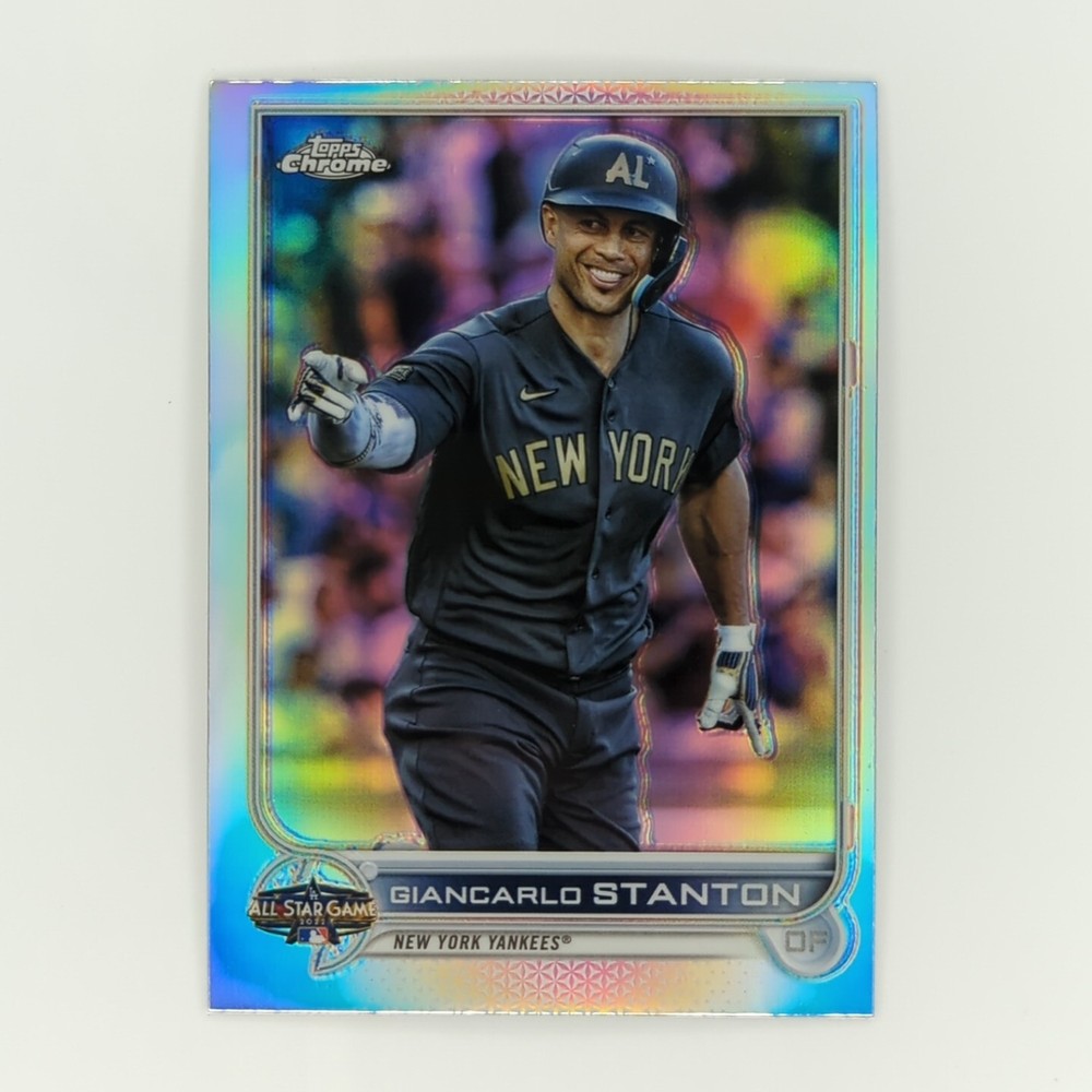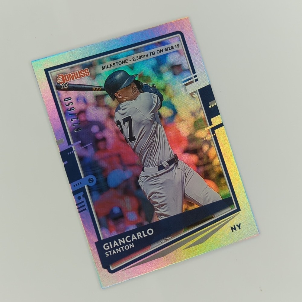 This Giancarlo Stanton trading card lot includes two cards from the 2020 Panini Donruss Baseball and 2022 Topps Chrome Update sets. The cards are parallel and feature Stanton in his New York Yankees uniform. One card is an AS Refractor insert and the other is a Silver Milestones parallel, both with a limited edition of only 650 copies. These cards are perfect for any Major League Baseball fan or trading card collector, especially those who admire Giancarlo Stanton's talent and achievements. Don't miss the opportunity to add these rare and valuable cards to your collection.