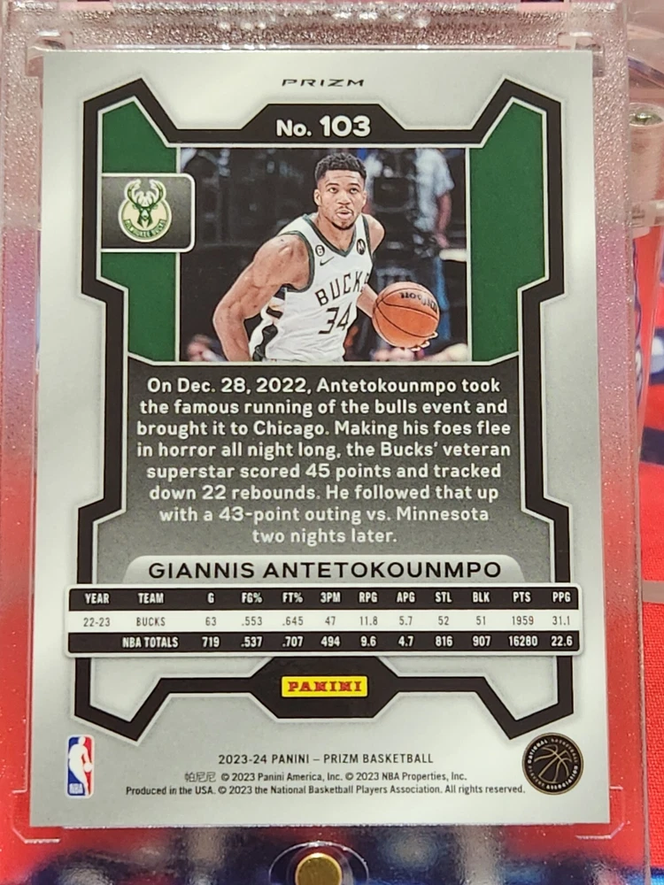 Card Number: 103 Season: 2023 Set: 23-24 Panini Prizm Features: Short Print League: National Basketball Association (NBA) Team: Milwaukee Bucks Player/Athlete: Giannis Antetokounmpo Card Name: Prizm Sport: Basketball Type: Sports Trading Card Autographed: No Manufacturer: Panini Parallel/Variety: Cracked Ice