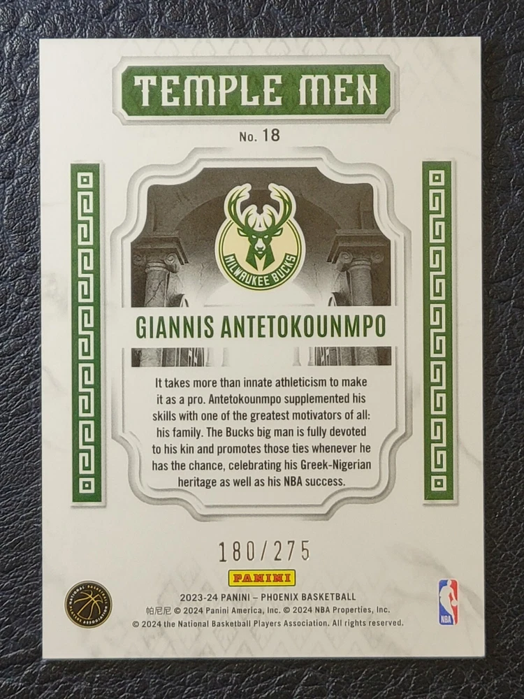 This Giannis Antetokounmpo 2023-24 Phoenix Temple Men Blue Lazer trading card is a must-have for any NBA fan. With a limited edition of only 275 cards produced, this card is a rare find and perfect for collectors. The card features a stunning blue laser design that is sure to catch the eye of any collector. The card is made of high-quality card stock and is serial numbered as 180 out of 275. It is an insert card from the 2023-24 Panini Phoenix set and is perfect for anyone who loves basketball trading cards. This card is not autographed but still holds great value. Get your hands on this unique card and add it to your collection today!