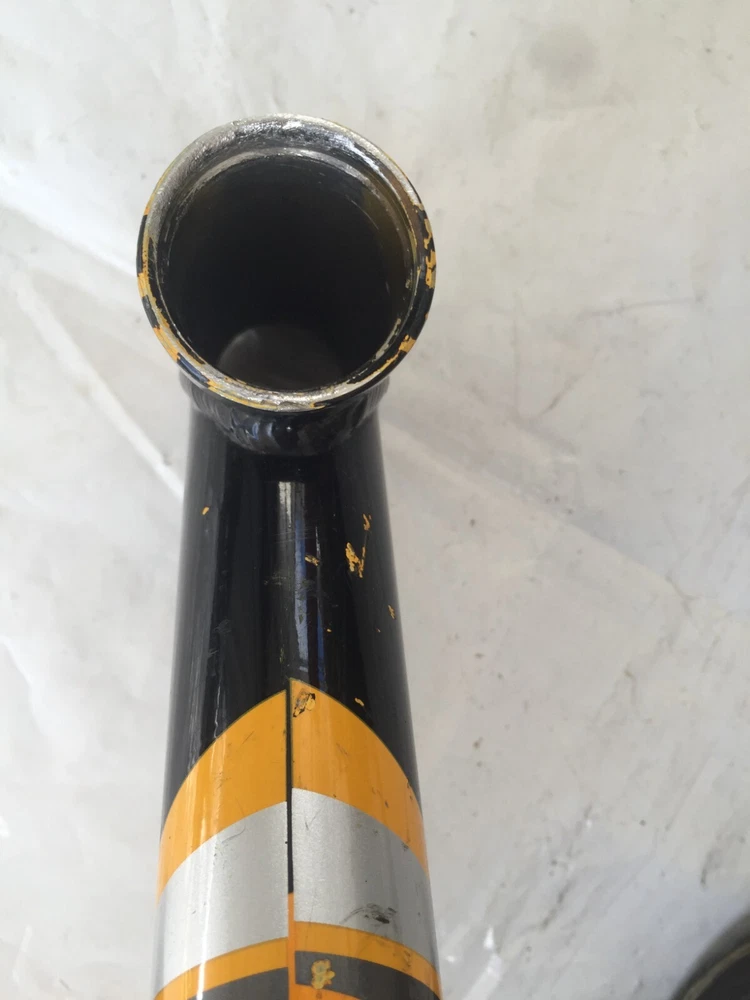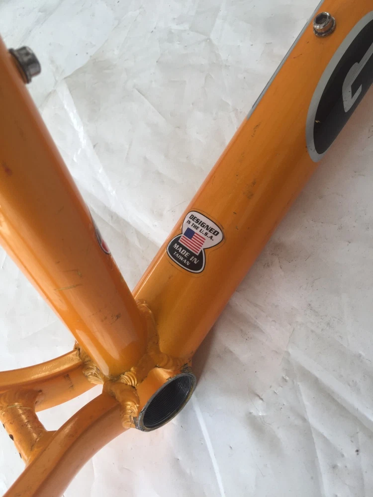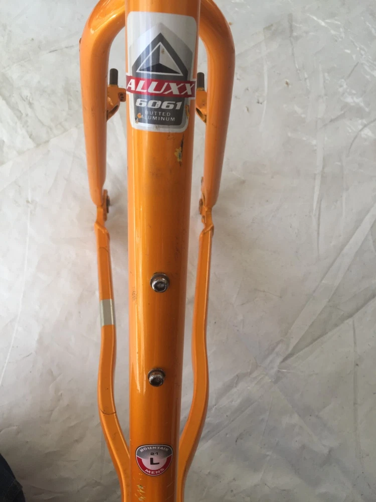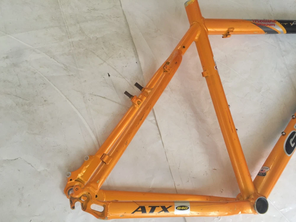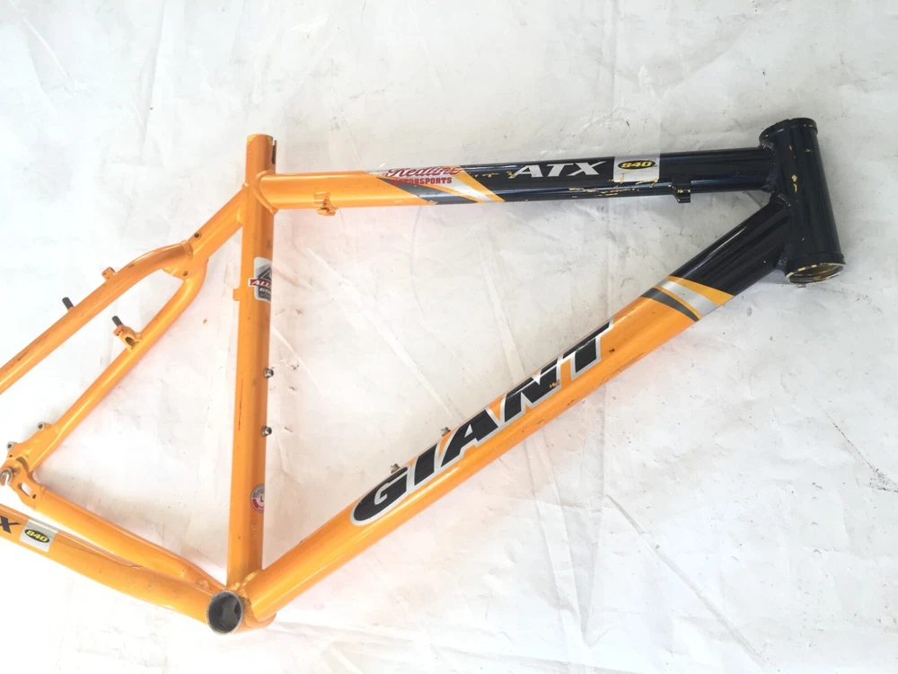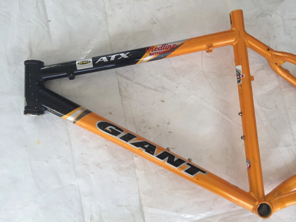 Giant ATX 840 mountain bike frame, for 26 inch wheel size. It says Large frame 21 inch frame I think its 1997 year or maybe 2003, not sure. No cranks, frame only. Light weight aluminum racing frame, hard tail 1.747 kg frame 425 chain stays It looks like roughly 600mm horizontal top tube. The lower head tube was slightly dented at the race at the front part, but I was able to bend it back to the original diameter and file it slightly. This should not affect anything when putting the bearing races in. Its back close to where it should be. Head tube 44mm inner diameter where the races go. No derailer hanger, but those can be found easily. Spares at bike store or online. Free Shipping to mainland USA 48 states & Canada. If outside that contact me for shipping price. Buyer Is Responsible to Make Sure Parts Fit their Application.