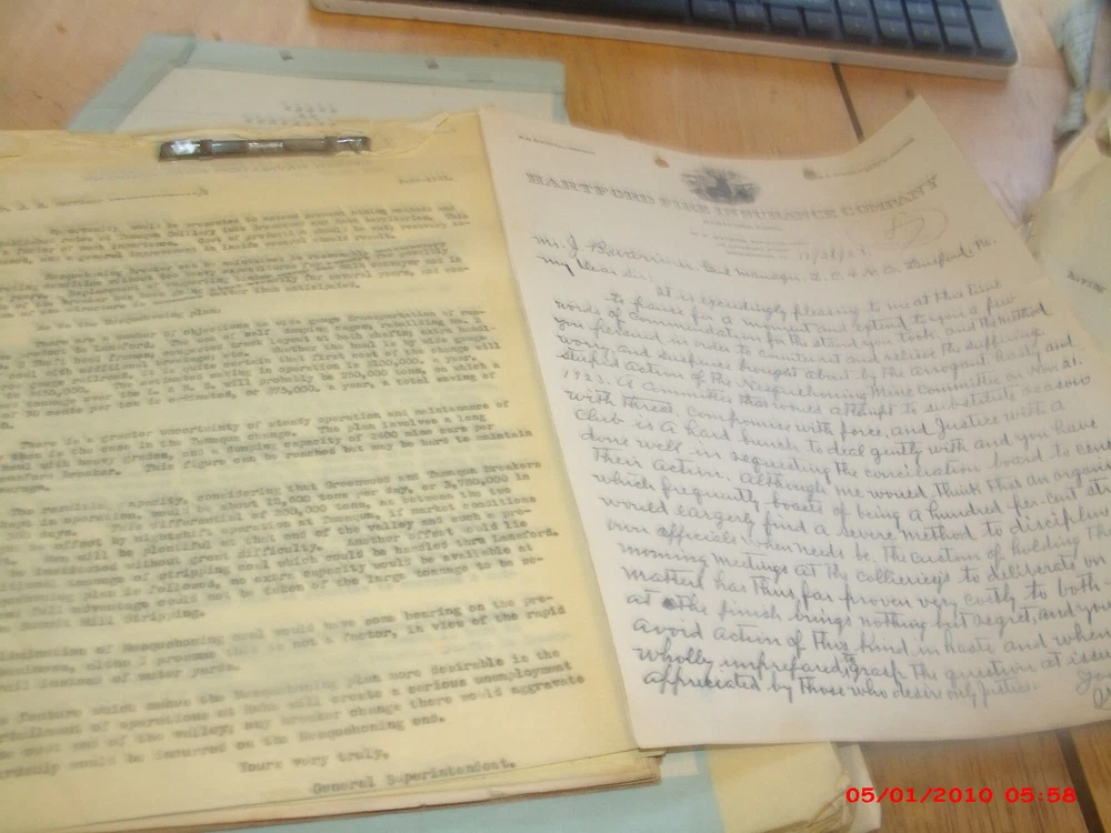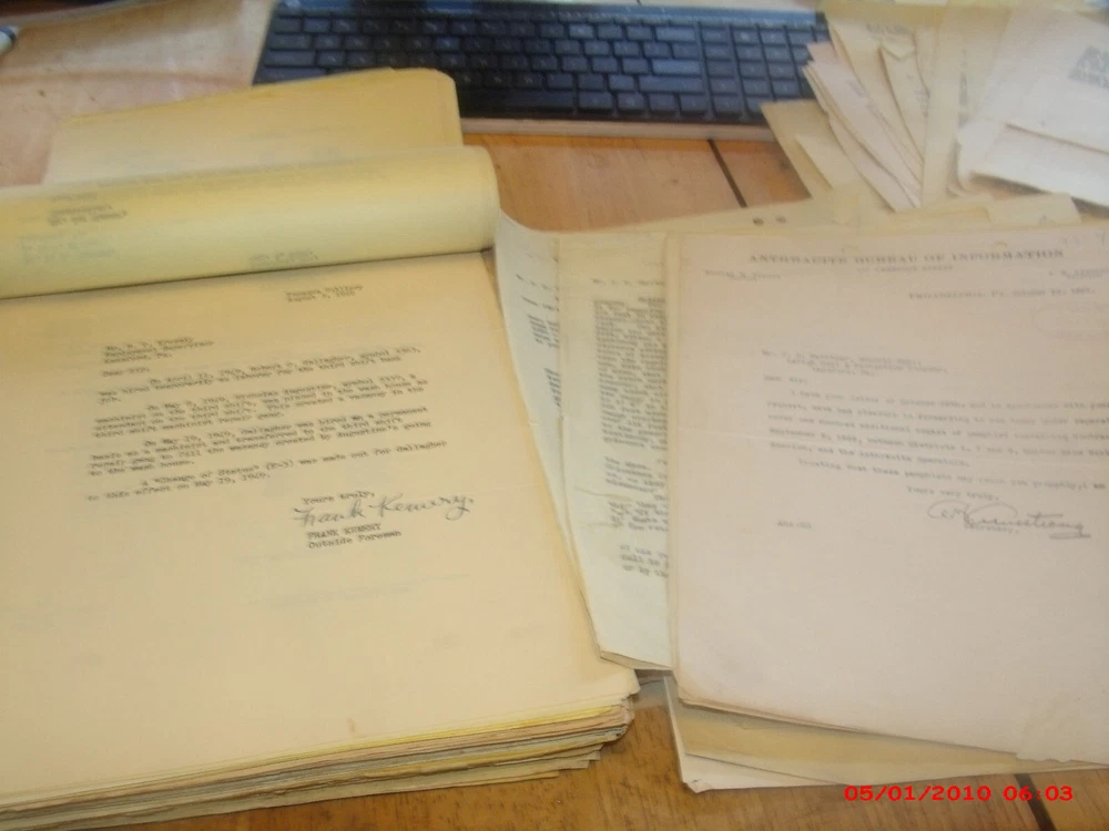 Giant collection of early 1900s to 1940s or so historical mining records,letters,court cases,news items,pay rate tables,mining statistics company records most likely from the desk of GM or CEO MR Warriner. Tons of signed items both carbon printed records and paper in the thousands. Worker names,wages,complaints law papers etc. I see letters from well know figures in the company and lawyers,and other public figures. All kinds of complaint letters and some newspapers related to families getting knocked out of their homes after miners got sick or died.Incredible historical records and documents right from the company executives desks. Many old coal mining towns in Pennsylvania are mentioned as well as the other offices in Philadelphia. Really stuff belonging in a museum. Individual papers usually go for $15.00-$20.00 each and their I believe are thousands of pages in the lot.Contact if interested in learning more. Historical items.