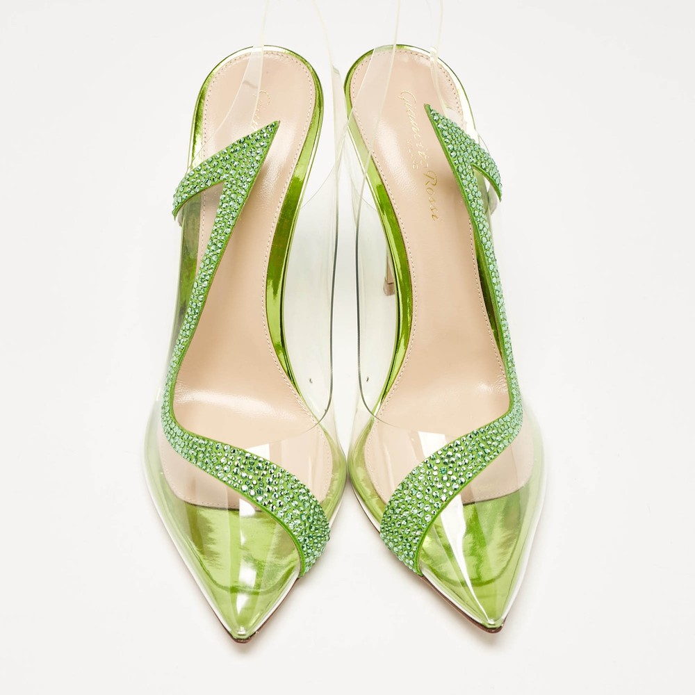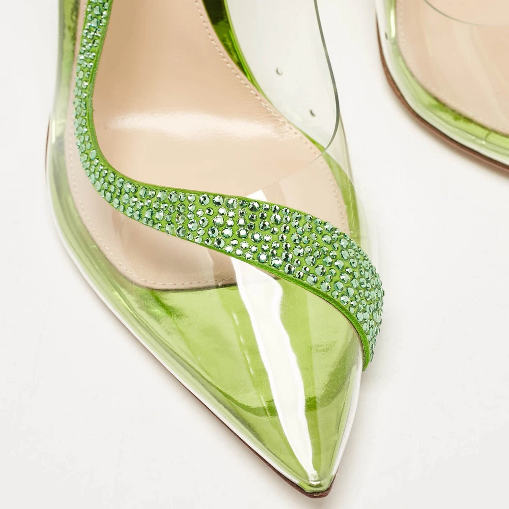 The Gianvito Rossi Hortensia pumps showcase a modern blend of luxury and innovation. Featuring a clear PVC design accented with green suede and intricate embellishments, these pumps offer a bold yet refined aesthetic. The pointed toe and slender stiletto heel create a sleek silhouette, perfect for adding sophistication to evening or formal looks.Certified by The Luxury Closet - This item has gone through a detailed authentication process overseen by our experts. We offer a lifetime guarantee of authenticity on all our items. Import duties, taxes and charges are not included in the item price. These charges are the buyers responsibility. Please check with your country’s customs office to determine what these additional cost will be prior to buying. Our eBay Store About Us Contact Us Add to Favorite Sellers Gianvito Rossi Transparent/Green PVC and Suede Embellished Hortensia Pumps Size 38 $387.2 The Gianvito Rossi Hortensia pumps showcase a modern blend of luxury and innovation. Featuring a clear PVC design accented with green suede and intricate embellishments, these pumps offer a bold yet refined aesthetic. The pointed toe and slender stiletto heel create a sleek silhouette, perfect for adding sophistication to evening or formal looks. Product Details Brand Color Transparent Dimensions Material PVC, Suede Size 38 Outsole Width 8 cm Outsole Length 23.5 cm Heel Height 10.5 cm Includes Original Dustbag, Original Box, Info Card Certified by The Luxury Closet This item has gone through a detailed authentication process overseen by our experts. We offer a lifetime guarantee of authenticity on all our items. How We Check The in-house team of experts at The Luxury Closet is highly trained to verify the authenticity and the condition of the luxury products. They ensure that only 100% authentic items are put on sale.The evaluation process is unique with its own mix of assessment criteria and differs according to the category. Each item is evaluated based on the following combination of hallmarks, hardware, stitching, symmetry, material, craftsmanship, stamping, codes, hologram stickers, and packaging. Our authenticators also check if the items have been modified or amended (e.g., aftermarket diamonds, replaced batteries, repaired bags, etc.) International Buyers Import duties, taxes and charges are not included in the item price. These charges are the buyers responsibility. Please check with your country’s customs office to determine what these additional cost will be prior to buying.