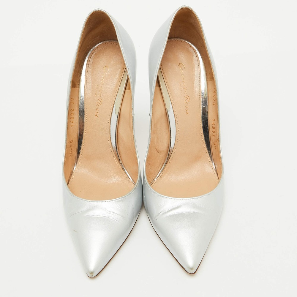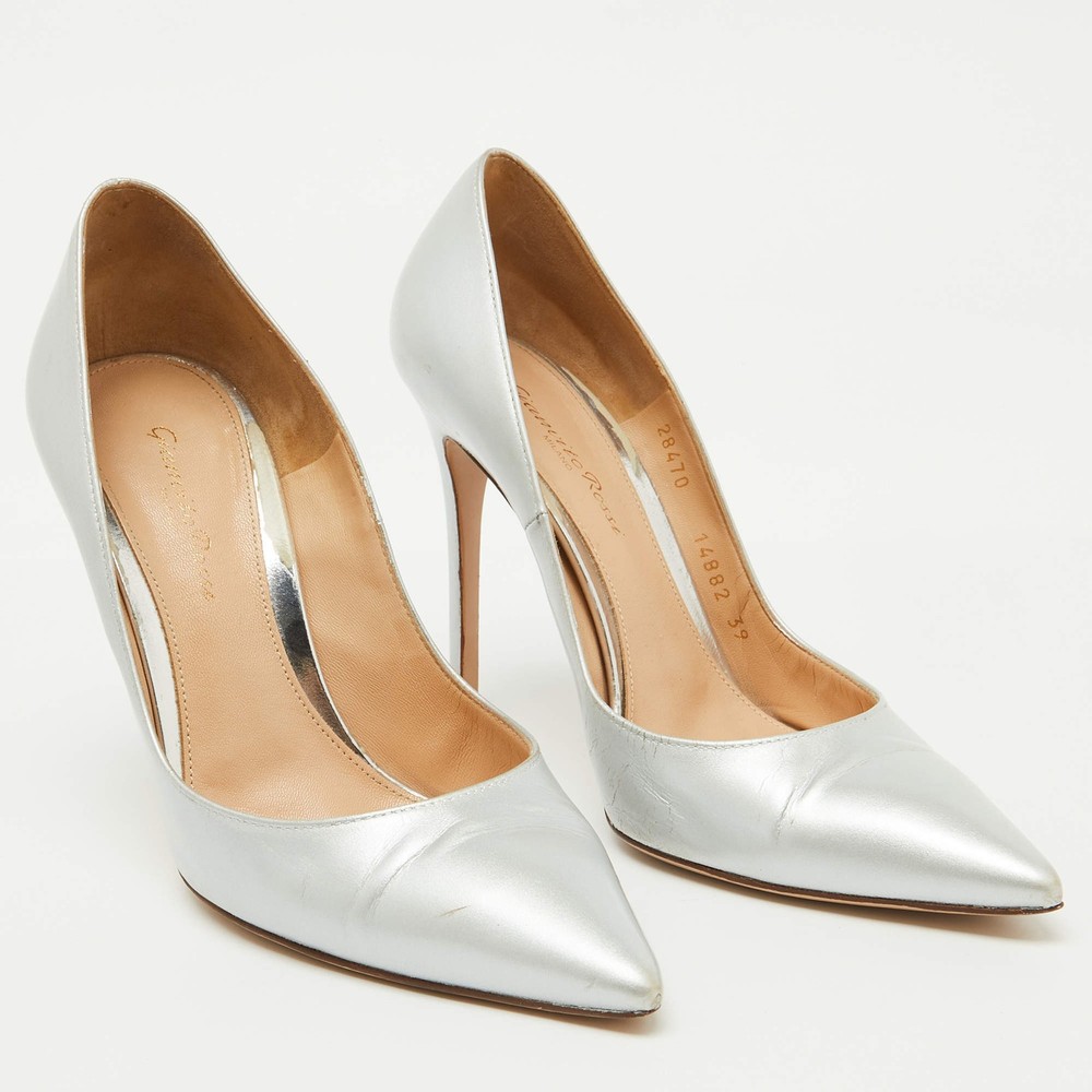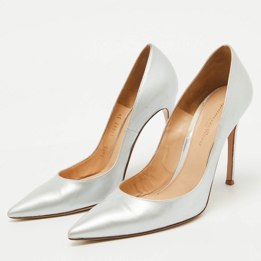 Our eBay Store About Us Contact Us Add to Favorite Sellers Gianvito Rossi Silver Leather Pointed Toe Pumps Size 39 Curvaceous arches, a feminine appeal, and a well-built structure define this set of designer pumps. Coming with comfortable insoles and sleek heels, style them with your favorite outfits. Product Details Brand Gianvito Rossi Color Silver Includes The Luxury Closet Packaging Outsole Length 25 cm Outsole Width 8.5 cm Size 39 Certified by The Luxury Closet This item has gone through a detailed authentication process overseen by our experts. We offer a lifetime guarantee of authenticity on all our items. How We Check The in-house team of experts at The Luxury Closet is highly trained to verify the authenticity and the condition of the luxury products. They ensure that only 100% authentic items are put on sale.The evaluation process is unique with its own mix of assessment criteria and differs according to the category. Each item is evaluated based on the following combination of hallmarks, hardware, stitching, symmetry, material, craftsmanship, stamping, codes, hologram stickers, and packaging. Our authenticators also check if the items have been modified or amended (e.g., aftermarket diamonds, replaced batteries, repaired bags, etc.) International Buyers Import duties, taxes and charges are not included in the item price. These charges are the buyers responsibility. Please check with your country’s customs office to determine what these additional cost will be prior to buying.