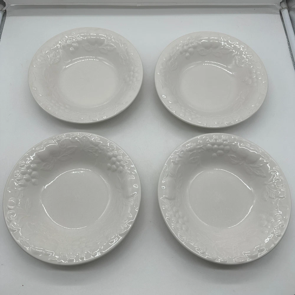 Gibson FLOURISH OFF WHITE Coupe Soup Bowl Set of 4. Made of stoneware in a round shape with a RAISED FRUIT design. The bowls are 8 1/8" in diameter, suitable for all occasions. The set includes four soup bowls. This contemporary original Gibson model features a white color and is made in China. The backstamp is printed on each bowl.