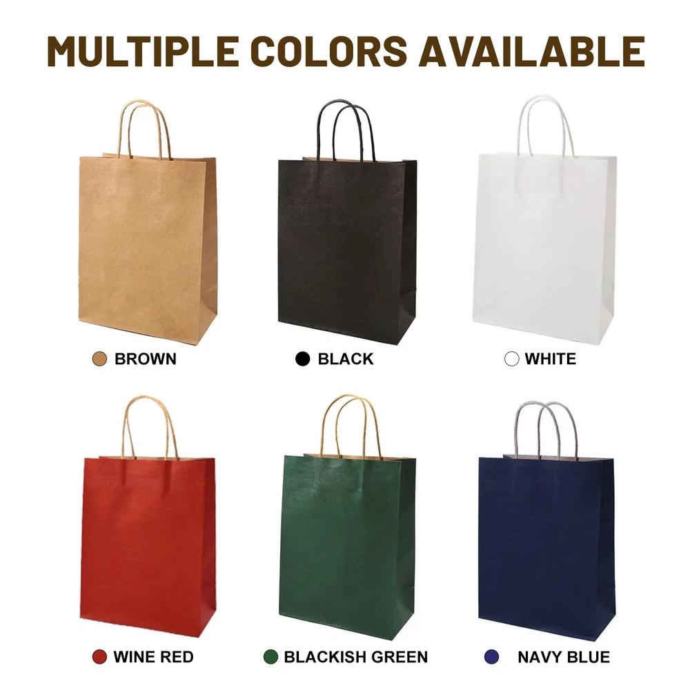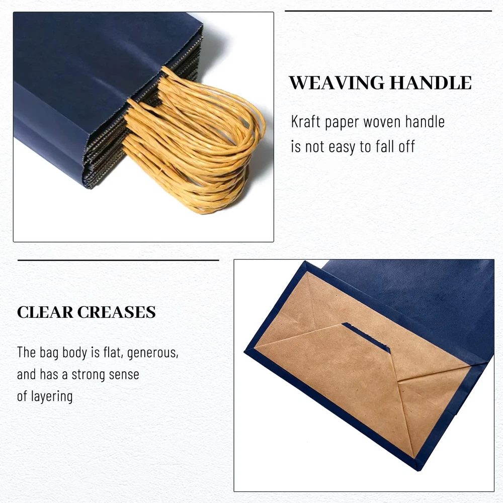 GREAT VALUE GIFT BAGS: These gift bags are made up of 100 pieces measuring 8.25" x 5.9" x 3.15" with handles made of high quality, sturdy paper material such as kraft or recycled paper. The handles are reinforced with two repeated coats of glue for added strength and durability and can carry a lot of weight without tearing. ECO-FRIENDLY CHOICE: These navy blue gift bags with handles are made from recycled materials and sustainable resources, they are biodegradable, recyclable, non-toxic and odorless,non-polluting, making them a great choice for environmentally conscious individuals. Using these bags instead of traditional plastic bags helps to reduce waste and promote sustainability. CONVENIENT GIFT BAGS: Handles provide an easy and comfortable way to carry packaging, and are often long enough to fit comfortably in the hand, whether it's for groceries, retail purchases or promotional items. Sturdy construction and ease of use make them a practical and stylish choice for packaging needs. DIY DECORATION: This gift bags are not printed with crafts, use your imagination and unleash your creativity to personalize them in any way you like. They can be decorated with ribbons, bows and other decorations to add a festive touch or personalized message. Additionally, they can be imprinted with logos or brand names, making them a great choice for businesses looking to enhance their brand image or enhance their customer experience. MULTIFUNCTIONALITY: This gift bags you can use them to hold a variety of small to medium crafts or light artwork, they are also ideal for fairs and farmers markets. In addition, they can be perfectly used for takeout orders or as shopping bags for customers without fear of damage. Also suitable for Christmas bags, Valentine's Day gift bags, shopping bags, holiday gift bags, party gift bags, retail bags, merchandise bags, wedding welcome bags.