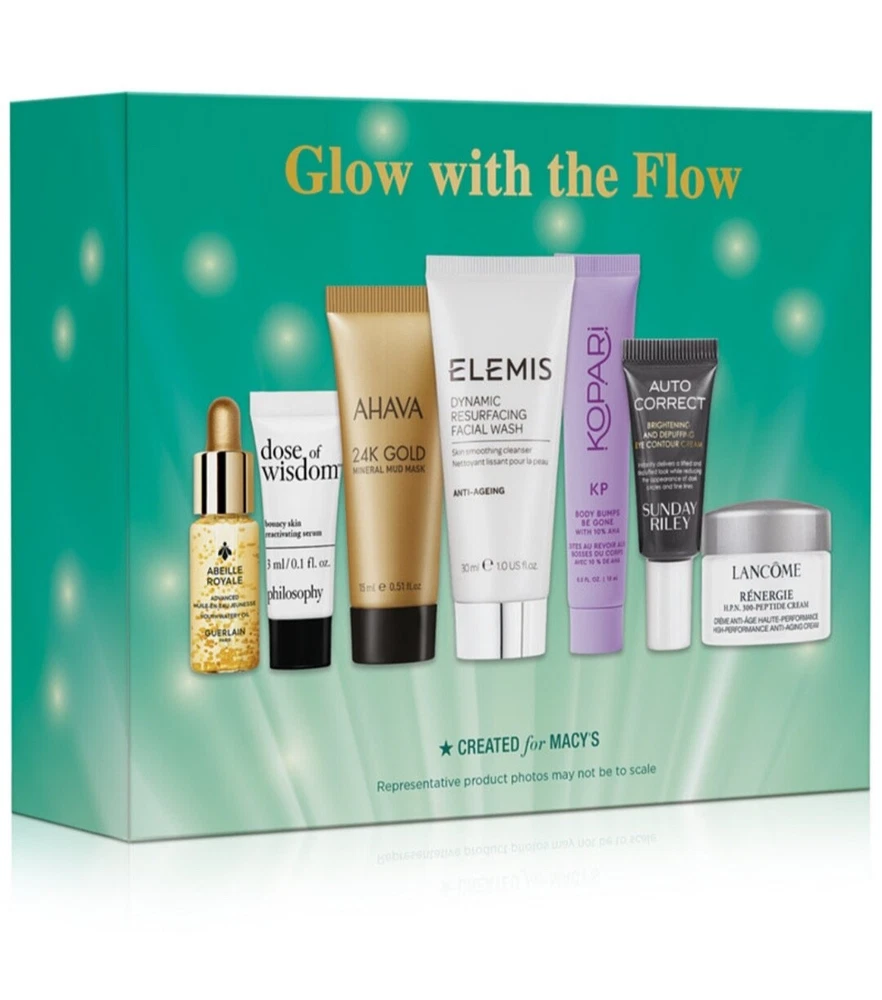 Product Details Elevate your glow with this set featuring seven skincare products for unparalleled radiance. SET INCLUDES: Ahava 24K Gold Mineral Mud Mask, 0.51 oz. Elemis Dynamic Resurfacing Facial Mask, 1 oz. Guerlain Abeille Royale Advanced Watery Oil, 0.16 oz. Kopari Beauty KP Body Bumps Be Gone Scrub, 0.5 oz. Lancôme Rénergie H.P.N. 300-Peptide Cream, 0.16 oz. philosophy Dose Of Wisdom Bouncy Skin Reactivating Serum, 0.1 oz. Sunday Riley Autocorrect Brightening & Depuffing Eye Contour Cream, 0.1 oz.