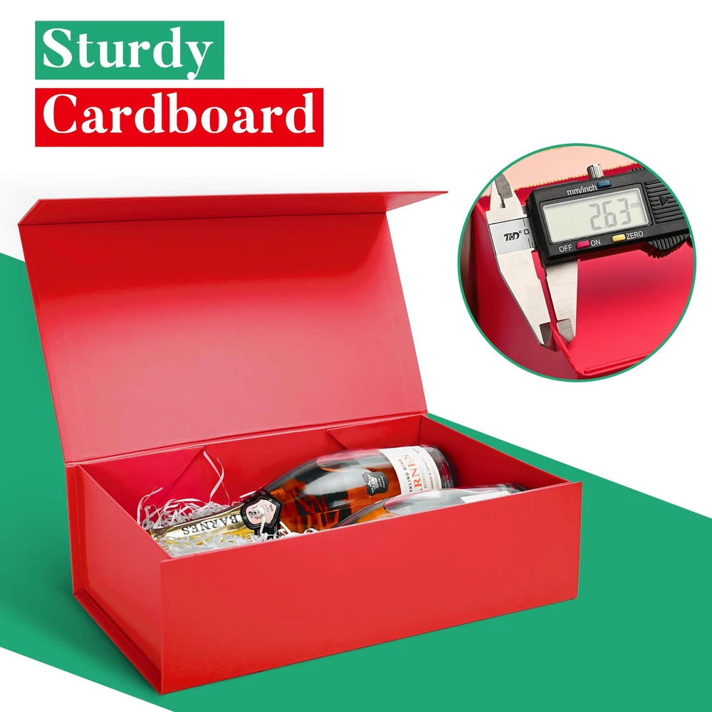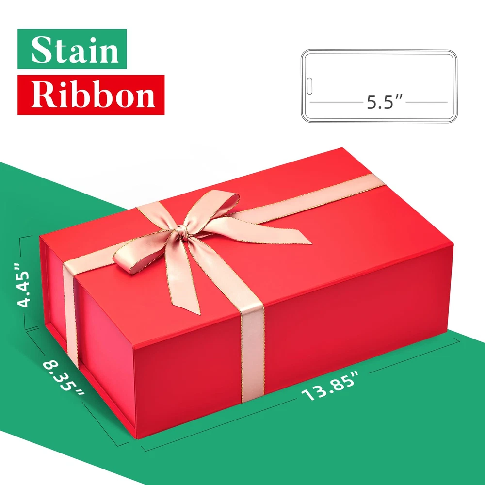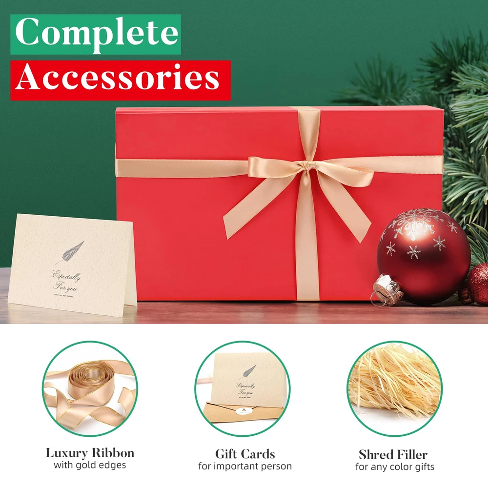 【Multiple Color & Size Options】store provides different packaging quantity for what you need, different color&sizes of gift boxes for your options. 【Magnetic Closure Design 】This Christmas gift boxes is design with concealed magnetic closure on two sides, which make the box open and close repeatedly easily. 【 Reusable & Easy Assembly】 The red present boxes are made from high-quality strength cardboard and wrapped with quality paper. Tear off white triangle stickers, then assemble and bond the box. The magnetic can be used as reusable gift boxes and storage box. 【Wide Application 】Our red gift wrap boxes are great for festival and everyday packaging. For business gifts, party, graduation ceremony, wedding, birthday gift, anniversary,Christmas, Thanksgiving and more occasions. Gift wrapping for jewelry, candies, toys, smaller clothing accessories etc. Wrapping gifts for family, kids, friends, or lovers. 【Package Lists】1 Pack 13.8'' X 8.5''×4.3''red gift box,2*Gift Card, 72 inch *Champagne ribbon, 30g Paper Filler. store provides different packaging quantity for what you need, different sizes of gift boxes for your options.