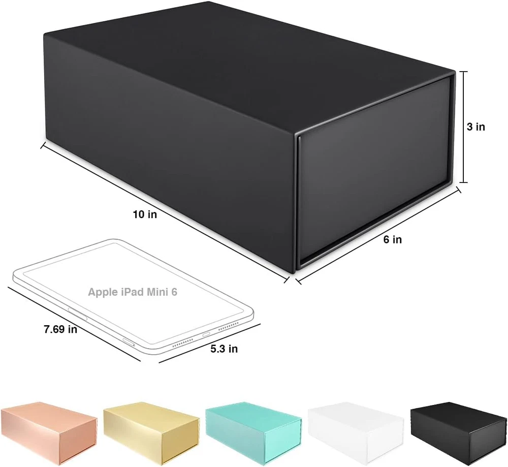 Store New Arrivals Add to Favorite View Feedback Contact Gift Box Black with Magnetic Closure Lid 10" X 6" X 3" Gift Box for Presents Description Unit Count 1.0 Count Number of Items 1 Color 10 inch Black Pattern Solid Product Dimensions 10"L x 6"W x 3"H Material Cardboard Country of Origin China Theme Glossy Occasion Mother's Day, Wedding, Christmas, Birthday, Thanksgiving Manufacturer PLAEVIAE Brand PLAEVIAE Included Components Sticker, Ribbon, Lid 💝 High Quality Material : These gift boxes are made of high quality recyclable cardboard material with a glossy finish. Sturdy and beautiful, no tears, durable, gift box size: 10*6*3 inches (Pack of 1). 💝 Easy to Assemble : Shipped as a flat box, we use a folding package that easily folds together in 2 steps using only magnets, no tape, just peel off the triangle sticker, then assemble and glue the box. Saves you valuable time and effort. 💝 Magnetic Sealing Lid : Designed with two super magnetic buttons and good sealing performance, stronger and more durable than other products with one magnetic button. 💝 Outstanding Functionality : Beautiful gift box allows you to wrap your gift without looking for wrapping paper, ribbon or tape. This simple gift box will enhance your gift and transform it into a unique showpiece. 💝 Wide Application : The gift box can hold clothes, jewelry, photos, perfumes, chocolates, toys, etc. It is the best box for presenting gifts perfectly. Beautifully wrapped box ensures your gift is perfect. Make sure to make your gift stand out on Mother's Day, Thanksgiving gift, Christmas gift, birthday party gift, wedding gift or any celebration. Product Description Powerful magnetic suction Double magnetic suction is stronger and more durable. Easy to use Easy to do by simply unzipping the white sticker. Perfect gift box The best choice for loved ones, friends and family. ABOUT US We offer the best prices around on high quality products. Our E-store includes media such as books, movies, music and games while offering electronics, toys, sporting apparel, clothing, tools, general home, garden items and more. SHIPPING We are always working hard to ensure your package arrives as soon as possible. Please understand that some factors like weather, high postal traffic, and the performance of shipping companies are outside of our control. We offer free shipping to the lower 48 states and ship within 2 business days of payment, usually sooner. We do not accept P.O. Boxes. Please provide a physical address. RETURNS We offer a 30-Day Return Policy on items which you are not completely satisfied with. You have the option for a full-refund or an exchange of the item. No returns are available on items shipped outside of the USA. PAYMENT We accept PayPal. CONTACT US This page content is yet to come Please ad us to your favorite seller and visit again later Thank You CUSTOMER SATISFACTION We try our very best to make sure every customer is completely satisfied. If there's a problem, message us! We're happy to help.