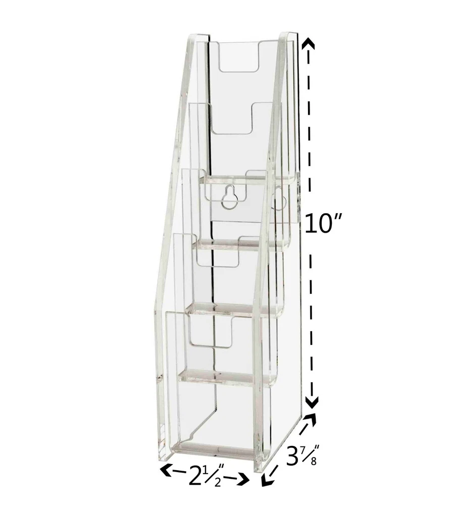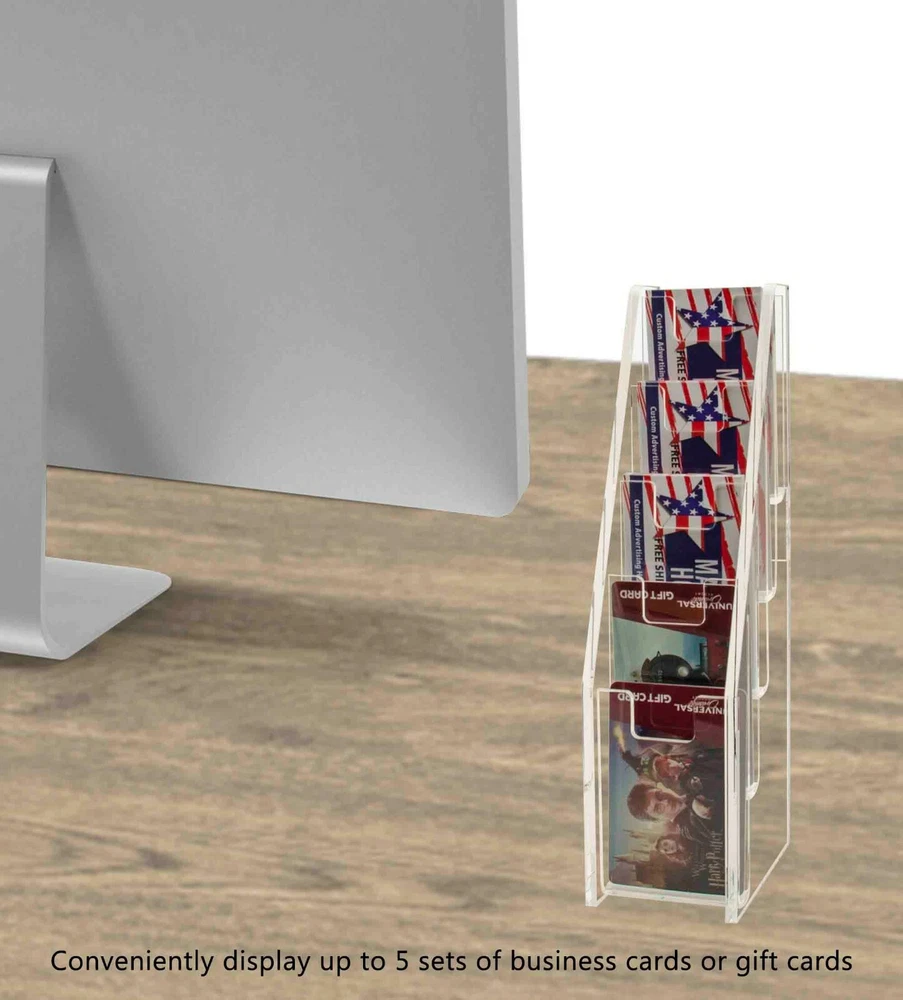 Tiered 5 Pocket Business Card Gift Card Holder Wall Mount or Countertop Lot of 24 Product Features: Overall dimensions: 2 1/2”W x 10”H x 3 7/8”D Pocket dimensions: 2 1/4”W x 1/2”D High quality premium acrylic, proudly made in the USA. This five pocket business card holder provides a sturdy display for vertically designed business cards or gift cards that complements any decor. Made of durable materials, the tiered design displays five sets of business cards and can be conveniently placed on walls or even desks, retail counters, tables or anywhere you want to leave your calling cards or gift cards for the taking. This holder is freestanding and portable. You can display on desks, retail counters, or tables. Pre-drilled with two keyholes for easy wall mounting or easily fits on a countertop. Wall hanging contact card cases and racks are perfect for locations with many employees and agents. Large office buildings or stores frequently use multi-pocket dispensers to distribute as much information at once. Other times, simple gift cards are placed in the pockets. *Hanging hardware not included *All sizes are approximate Return Policy 30 Day Return Policy: By purchasing our product you are agreeing to our return policy, so please read! Perfect returns (NO used merchandise) on stock items are accepted within 30 days of delivery. Any visual appearance that the product is used will result in 00 refund. All returns are subject to a 20% inspection, re-boxing and restocking fee. All returns must be repacked and returned in their original packaging for protection. (MUST return on pallet if received on Pallet) Packages being returned should be insured by you for your protection No credits are issued on shipping costs. Absolutely no returns accepted on custom order displays, including orders with custom text, imprinting or graphics