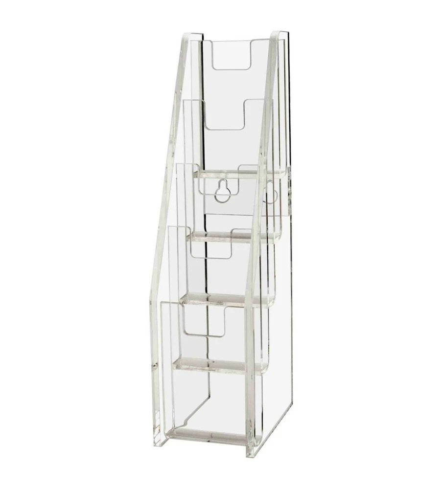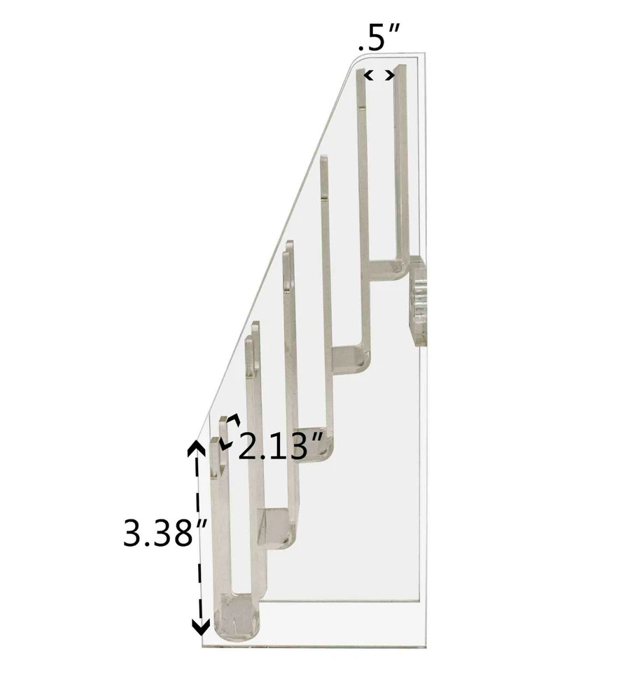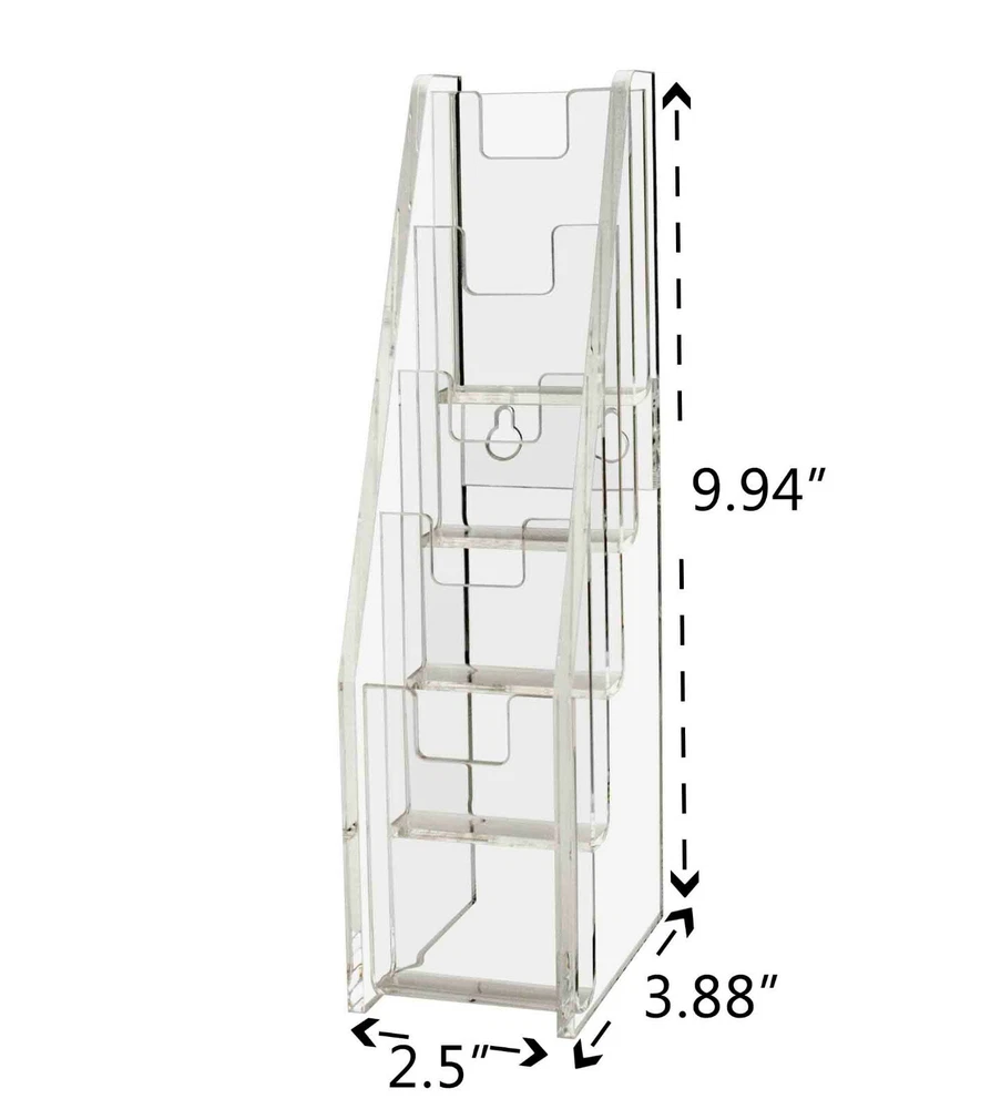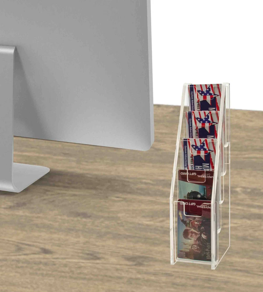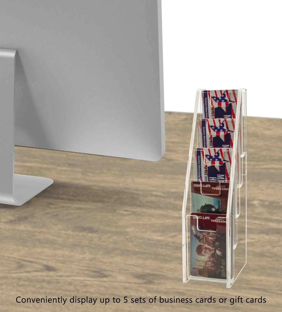 Tiered 5 Pocket Business Card Gift Card Holder Wall Mount or Countertop Product Features: Overall dimensions: 2 1/2”W x 10”H x 3 7/8”D Pocket dimensions: 2 1/4”W x 1/2”D High quality premium acrylic, proudly made in the USA. This five pocket business card holder provides a sturdy display for vertically designed business cards or gift cards that complements any decor. Made of durable materials, the tiered design displays five sets of business cards and can be conveniently placed on walls or even desks, retail counters, tables or anywhere you want to leave your calling cards or gift cards for the taking. This holder is freestanding and portable. You can display on desks, retail counters, or tables. Pre-drilled with two keyholes for easy wall mounting or easily fits on a countertop. Wall hanging contact card cases and racks are perfect for locations with many employees and agents. Large office buildings or stores frequently use multi-pocket dispensers to distribute as much information at once. Other times, simple gift certificates are placed in the pockets. *Hanging hardware not included *All sizes are approximate Return Policy 30 Day Return Policy: By purchasing our product you are agreeing to our return policy, so please read! Perfect returns (NO used merchandise) on stock items are accepted within 30 days of delivery. Any visual appearance that the product is used will result in 00 refund. All returns are subject to a 20% inspection, re-boxing and restocking fee. All returns must be repacked and returned in their original packaging for protection. (MUST return on pallet if received on Pallet) Packages being returned should be insured by you for your protection No credits are issued on shipping costs. Absolutely no returns accepted on custom order displays, including orders with custom text, imprinting or graphics