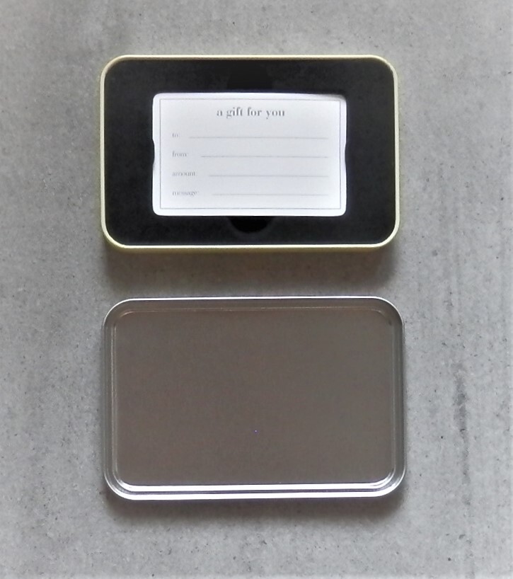 You are bidding on: Gift Card Gift Tin/Box Metallic Circles Design With Gift Card Holder + Gift Tag size: square with about but not exactly: 4 in x 4 in original seal and never open or used