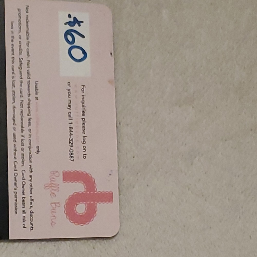 Gift Card of $60 at www.RuffleBuns.com. Please see picture for details Gift card # Hidden to keep its unused authentication valid for buyer.