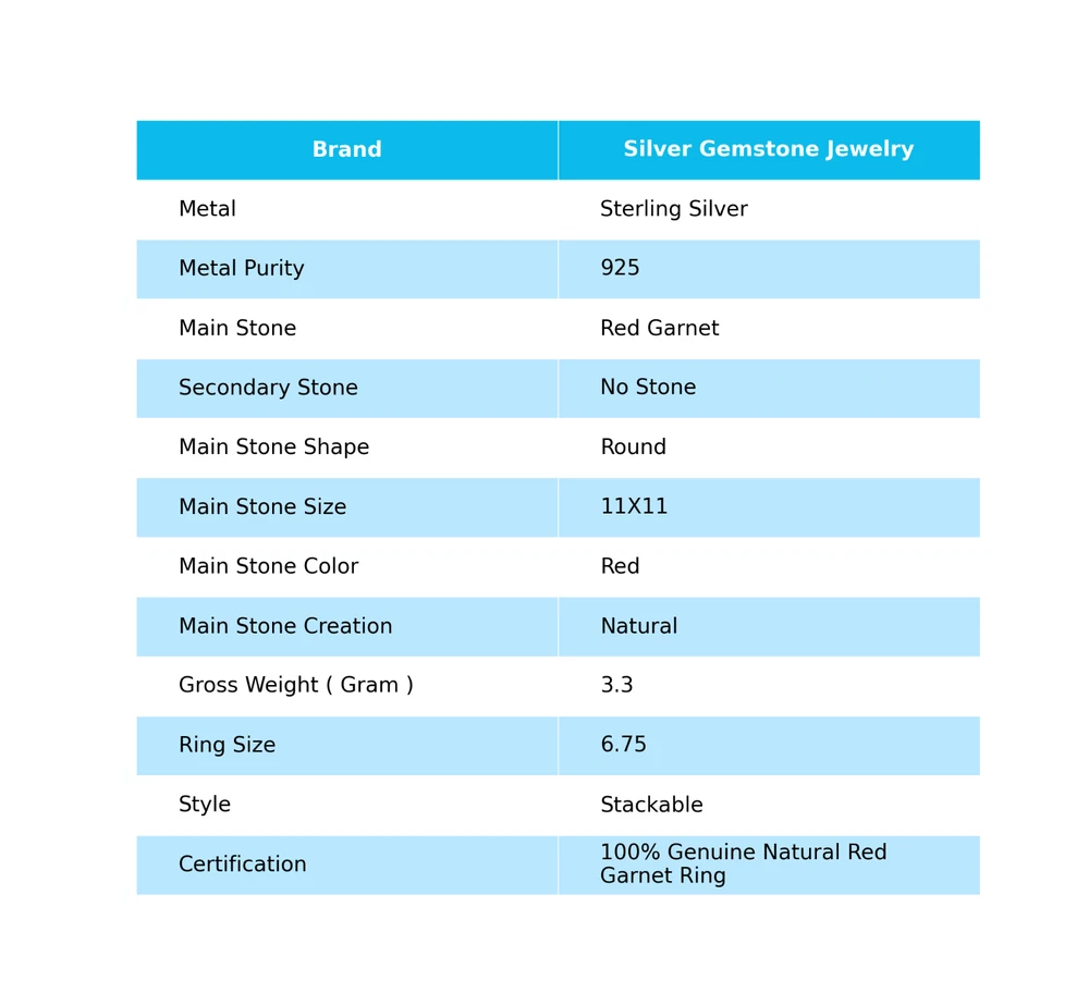 Welcome to Jaipur Silver Gallery Gift For Her 925 Silver Natural Red Garnet Stackable Minimalist Ring Size 6.75 Handmade Ring, Sterling Silver Ring, Red Garnet Ring, Handcrafted Ring SKU : - UKR-2919 Gemstone : - Red Garnet Stone Shape : - Round Metal : - Sterling Silver Metal Purity : - 925 Ring Size : - 6.75 US Adjustable : - _______________________________________________________________________________________ Amazing Properties of Silver ****************************** Tough and Long-lasting: Silver is incredibly strong, built to withstand daily wear and tear as well as tough environmental conditions. Easy to Shape and Design: Silver is like clay for skilled craftsmen, allowing them to create beautiful and intricate designs effortlessly. Great at Conducting Energy: When it comes to heat and electricity, silver is the go-to. It can quickly and efficiently transfer energy, making it ideal for various applications. Keeps Things Clean and Safe: Silver has a natural ability to keep harmful bacteria at bay, making it a reliable choice for promoting cleanliness and well-being. 3 Underrated Benefits Of Silver ****************************** Gorgeous Charm: Silver jewelry shines brightly, enhancing any outfit and fitting everyone's style with ease. Gentle on Skin: Silver is kind to your skin, reducing the chance of allergies and making it a favorite choice for accessories. Healing Vibes: Some believe silver jewelry has a soothing touch, possibly aiding in easing issues like arthritis, anxiety, and the blues. _______________________________________________________________________________________ For Mother's Day Gift For Father's Day Gift For Promise For Valentine' Day For Halloween Party For Christmas Day Gift For New Year Party For Mom For Her _______________________________________________________________________________________ If you need more help or want design tips, just give us a shout! We're lightning-fast in getting back to you. Every single thing we create is made by hand in our special workshop, and we put a whole lot of love and care into every piece. Thank you for stopping by! We're confident you'll have an amazing time shopping with us. We're here to make sure every moment you spend with us is filled with delight and satisfaction. Happy shopping!