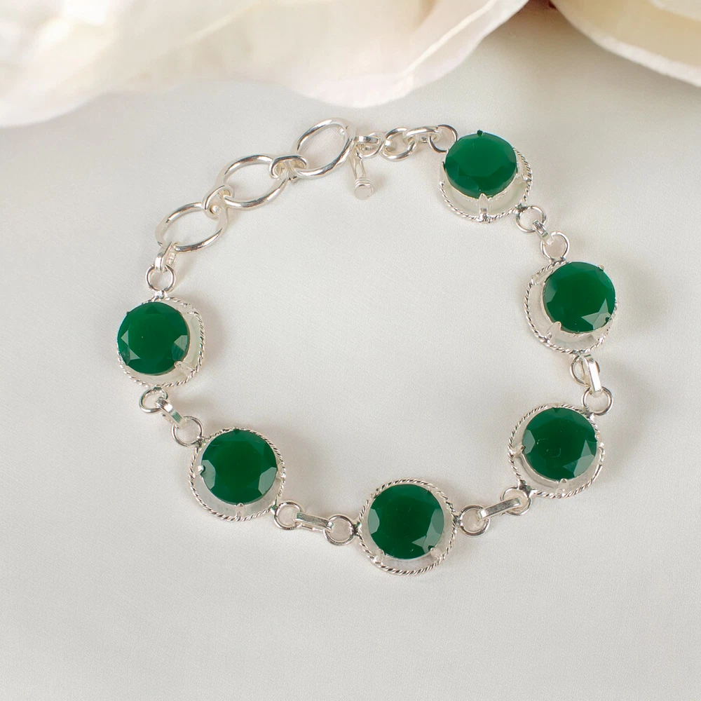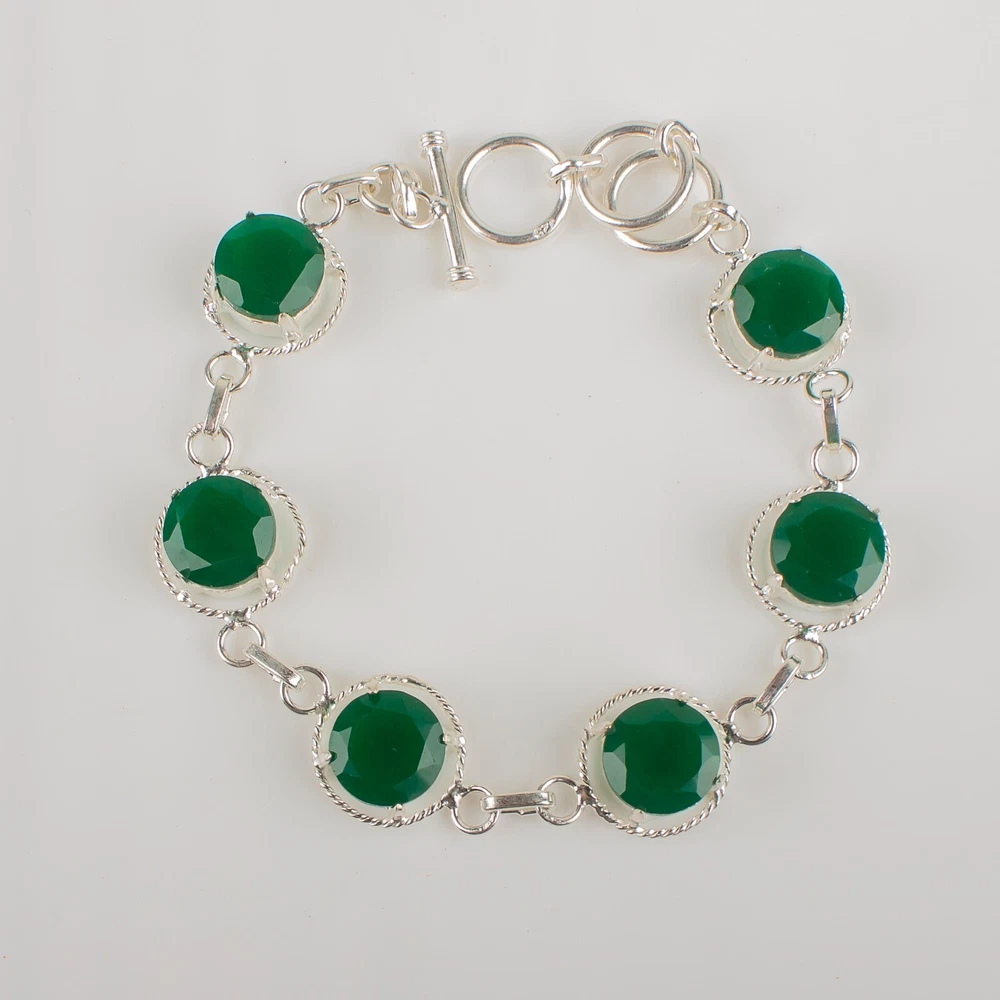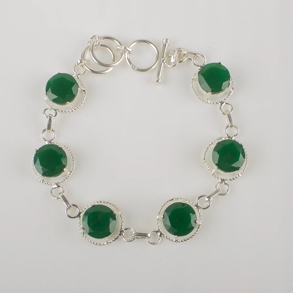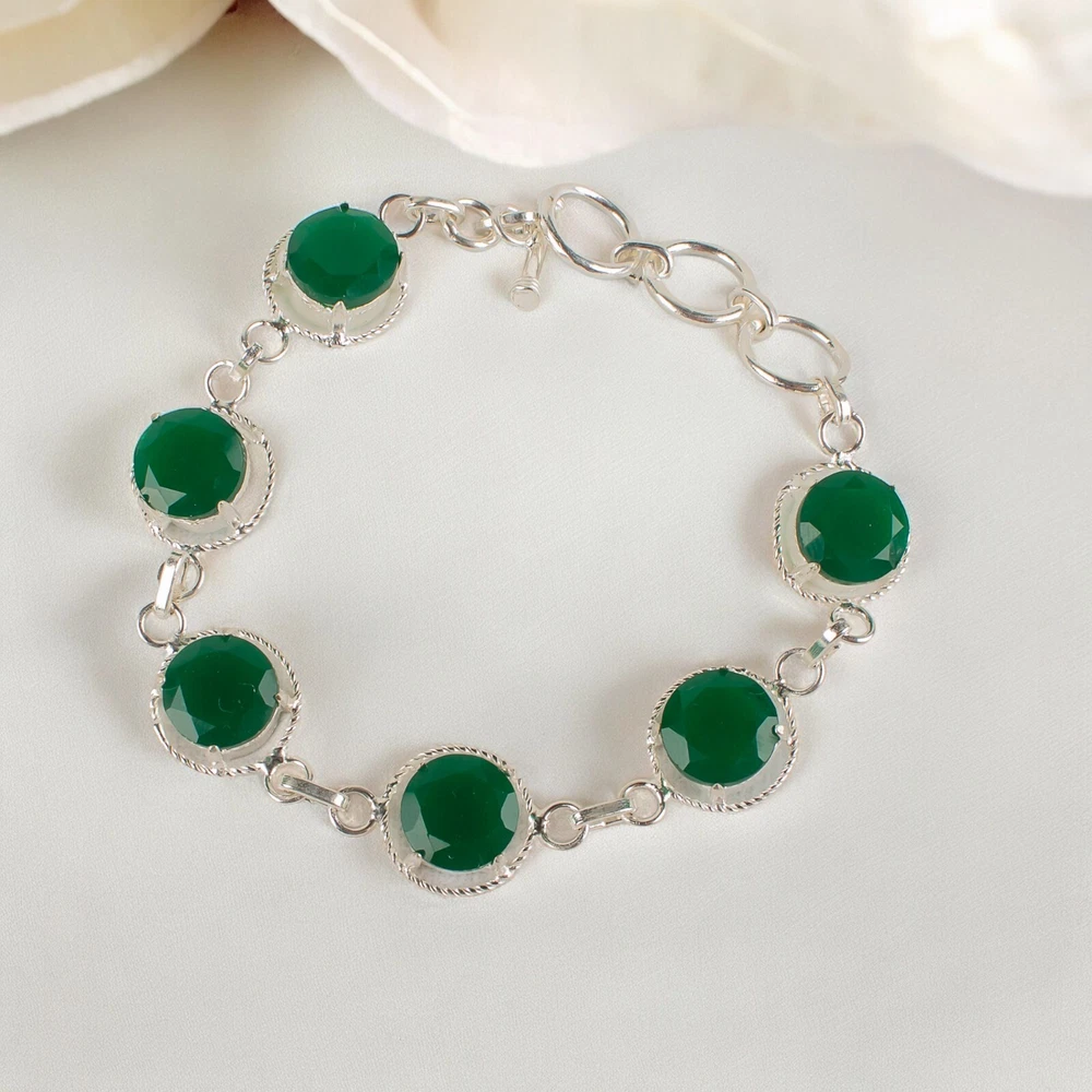 Welcome to Jaipur Silver Gallery Gift For Her 925 Sterling Silver Natural Green Onyx Gemstone Chain Bracelet Handmade Bracelet, Sterling Silver Bracelet, Green Onyx Bracelet, Handcrafted Bracelet SKU : - JSRB-1-17 Gemstone : - Green Onyx Stone Shape : - Round Metal : - Sterling Silver Metal Purity : - 925 Bracelet Length : 7.8 Inches Adjustable : _______________________________________________________________________________________ Amazing Properties of Silver ****************************** Tough and Long-lasting: Silver is incredibly strong, built to withstand daily wear and tear as well as tough environmental conditions. Easy to Shape and Design: Silver is like clay for skilled craftsmen, allowing them to create beautiful and intricate designs effortlessly. Great at Conducting Energy: When it comes to heat and electricity, silver is the go-to. It can quickly and efficiently transfer energy, making it ideal for various applications. Keeps Things Clean and Safe: Silver has a natural ability to keep harmful bacteria at bay, making it a reliable choice for promoting cleanliness and well-being. 3 Underrated Benefits Of Silver ****************************** Gorgeous Charm: Silver jewelry shines brightly, enhancing any outfit and fitting everyone's style with ease. Gentle on Skin: Silver is kind to your skin, reducing the chance of allergies and making it a favorite choice for accessories. Healing Vibes: Some believe silver jewelry has a soothing touch, possibly aiding in easing issues like arthritis, anxiety, and the blues. _______________________________________________________________________________________ For Mother's Day Gift For Father's Day Gift For Promise For Valentine' Day For Halloween Party For Christmas Day Gift For New Year Party For Mom For Her _______________________________________________________________________________________ If you need more help or want design tips, just give us a shout! We're lightning-fast in getting back to you. Every single thing we create is made by hand in our special workshop, and we put a whole lot of love and care into every piece. Thank you for stopping by! We're confident you'll have an amazing time shopping with us. We're here to make sure every moment you spend with us is filled with delight and satisfaction. Happy shopping!
