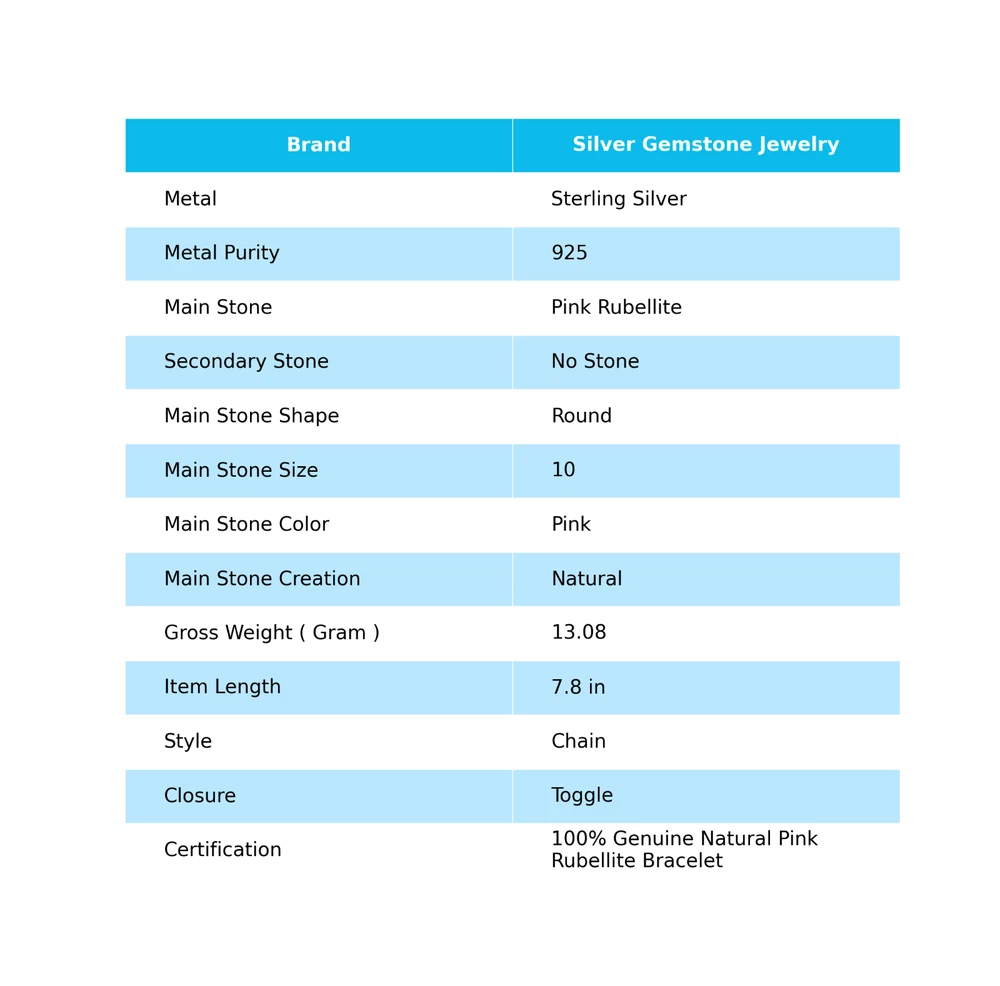 Welcome to Jaipur Silver Gallery Gift For Her 925 Sterling Silver Natural Pink Rubellite Gemstone Chain Bracelet Handmade Bracelet, Sterling Silver Bracelet, Pink Rubellite Bracelet, Handcrafted Bracelet SKU : - JSRB-1-10 Gemstone : - Pink Rubellite Stone Shape : - Round Metal : - Sterling Silver Metal Purity : - 925 Bracelet Length : 7.8 Inches Adjustable : _______________________________________________________________________________________ Amazing Properties of Silver ****************************** Tough and Long-lasting: Silver is incredibly strong, built to withstand daily wear and tear as well as tough environmental conditions. Easy to Shape and Design: Silver is like clay for skilled craftsmen, allowing them to create beautiful and intricate designs effortlessly. Great at Conducting Energy: When it comes to heat and electricity, silver is the go-to. It can quickly and efficiently transfer energy, making it ideal for various applications. Keeps Things Clean and Safe: Silver has a natural ability to keep harmful bacteria at bay, making it a reliable choice for promoting cleanliness and well-being. 3 Underrated Benefits Of Silver ****************************** Gorgeous Charm: Silver jewelry shines brightly, enhancing any outfit and fitting everyone's style with ease. Gentle on Skin: Silver is kind to your skin, reducing the chance of allergies and making it a favorite choice for accessories. Healing Vibes: Some believe silver jewelry has a soothing touch, possibly aiding in easing issues like arthritis, anxiety, and the blues. _______________________________________________________________________________________ For Mother's Day Gift For Father's Day Gift For Promise For Valentine' Day For Halloween Party For Christmas Day Gift For New Year Party For Mom For Her _______________________________________________________________________________________ If you need more help or want design tips, just give us a shout! We're lightning-fast in getting back to you. Every single thing we create is made by hand in our special workshop, and we put a whole lot of love and care into every piece. Thank you for stopping by! We're confident you'll have an amazing time shopping with us. We're here to make sure every moment you spend with us is filled with delight and satisfaction. Happy shopping!
