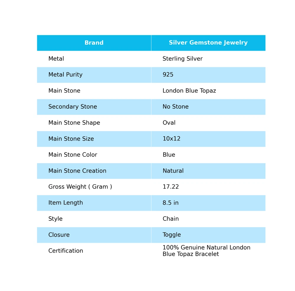 Welcome to Jaipur Silver Gallery Gift For Women Chain Bracelet 925 Silver Natural London Blue Topaz Gemstone Handmade Bracelet, Sterling Silver Bracelet, London Blue Topaz Bracelet, Handcrafted Bracelet SKU : - JSRB-3-11 Gemstone : - London Blue Topaz Stone Shape : - Oval Metal : - Sterling Silver Metal Purity : - 925 Bracelet Length : 8.5 Inches Adjustable : _______________________________________________________________________________________ Amazing Properties of Silver ****************************** Tough and Long-lasting: Silver is incredibly strong, built to withstand daily wear and tear as well as tough environmental conditions. Easy to Shape and Design: Silver is like clay for skilled craftsmen, allowing them to create beautiful and intricate designs effortlessly. Great at Conducting Energy: When it comes to heat and electricity, silver is the go-to. It can quickly and efficiently transfer energy, making it ideal for various applications. Keeps Things Clean and Safe: Silver has a natural ability to keep harmful bacteria at bay, making it a reliable choice for promoting cleanliness and well-being. 3 Underrated Benefits Of Silver ****************************** Gorgeous Charm: Silver jewelry shines brightly, enhancing any outfit and fitting everyone's style with ease. Gentle on Skin: Silver is kind to your skin, reducing the chance of allergies and making it a favorite choice for accessories. Healing Vibes: Some believe silver jewelry has a soothing touch, possibly aiding in easing issues like arthritis, anxiety, and the blues. _______________________________________________________________________________________ For Mother's Day Gift For Father's Day Gift For Promise For Valentine' Day For Halloween Party For Christmas Day Gift For New Year Party For Mom For Her _______________________________________________________________________________________ If you need more help or want design tips, just give us a shout! We're lightning-fast in getting back to you. Every single thing we create is made by hand in our special workshop, and we put a whole lot of love and care into every piece. Thank you for stopping by! We're confident you'll have an amazing time shopping with us. We're here to make sure every moment you spend with us is filled with delight and satisfaction. Happy shopping!