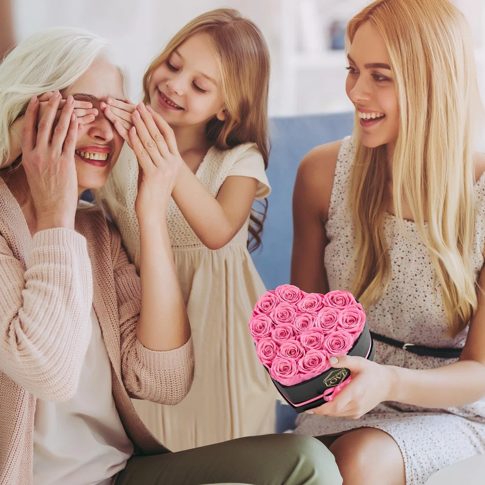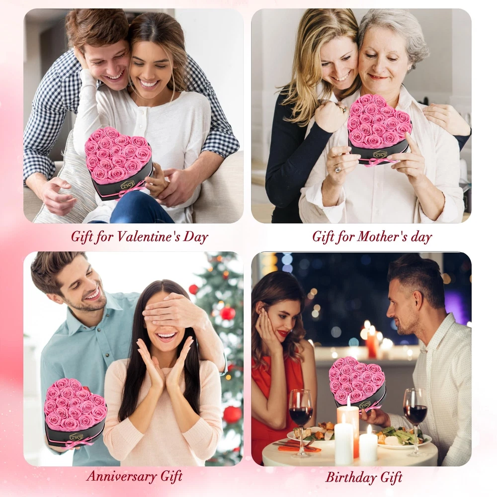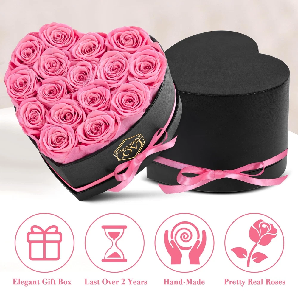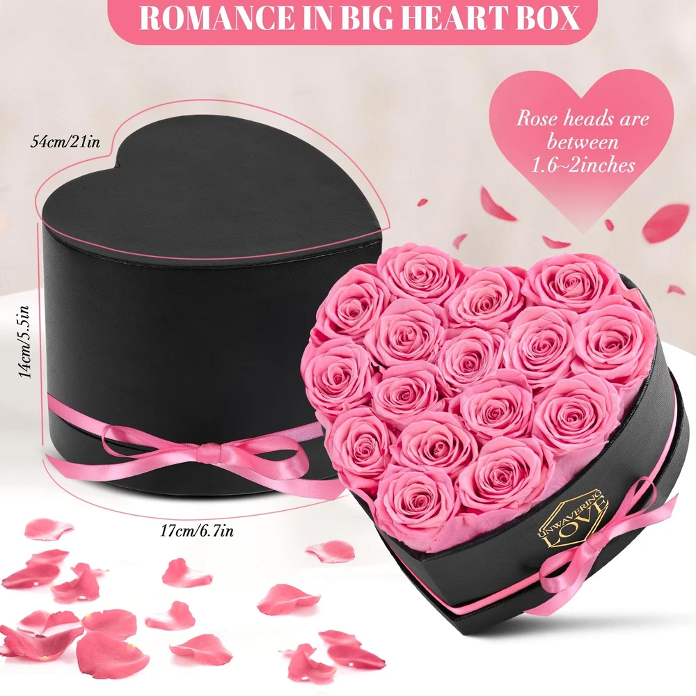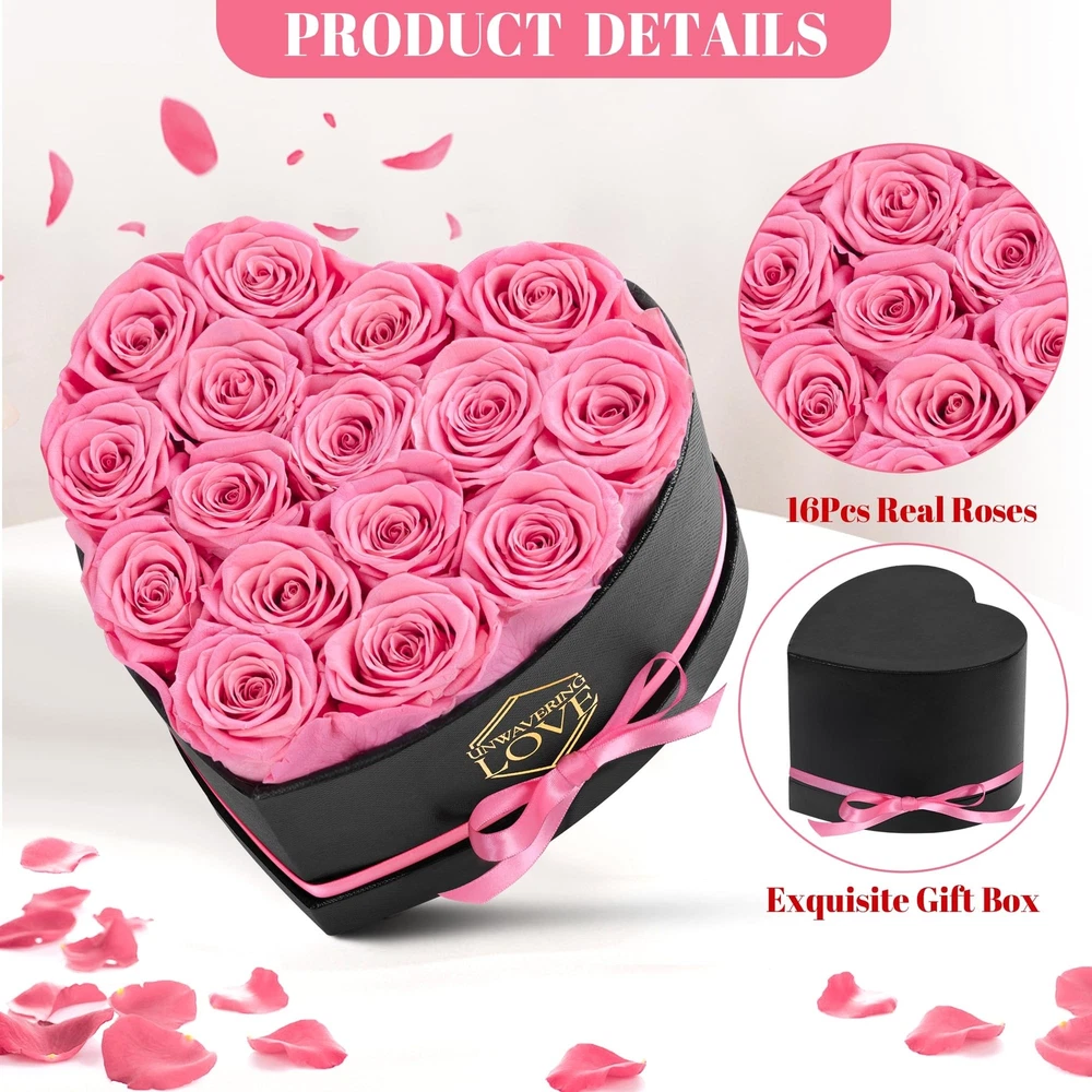 Gift for Mom Pink 16Pcs Eternal Preserved Roses Flowers in Heart Shape Box Mothers Day Birthday Gifts for Mom Women Product Details Color: Pink Brand: POMINEL MPN: G-HEART-PI UPC: Does not apply EAN: Does not apply Package Dimensions: 7.28 x 7.24 x 5.98 inches Item Weight: 1.32 pounds Manufacturer: POMINEL Item model number: G-HEART-PI Batteries required: No Real Roses: The preserved rose gift box is made of natural roses, the flowers are carefully placed in a heart-shape box, the packaging is printed with unwavering love, it can be as an ideal gift for her. Elegant Display Box: With 16 pink roses in a heart-shape box that also includes a exquisite gift box, our preserved rose gift box makes a great Valentine's Day gift. Long Lasting Romance: The preserved roses is treated in a special way, the diameter of the bud is 1.6-2in, at room temperature, without watering and direct sunlight, can be stored for 1-3 years. Forever Love: Whether it's Valentine's Day, Mother's Day, birthday, anniversary, or any special occasion, our preserved roses are the ideal gift for her to show your forever love. Thoughtful Gifts: Preserved rose gift box is an ideal gift for a girlfriend, wife, mom or any special woman in your life, these eternal roses are a genuine gift that expresses love and gratitude.