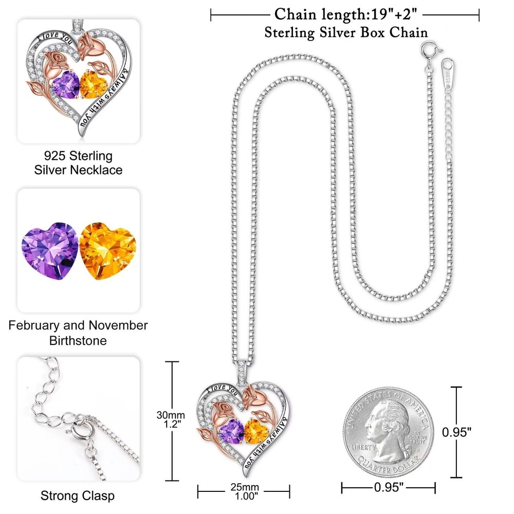 Jewelry Gifts: Mothers Day Gifts for Women Birthday Gifts for Women Anniversary Gifts for Women Christmas Gifts for Women Valentines Day Gifts for Women Jewelry Attention Please avoid contacting with the acid and alkali, corrosive substances. Please avoid the collision, so as to avoid surface scratches. Please avoid wearing it when sweating a lot, shower or sleep, etc. Please wipe them with soft cloth when you clean your jewelries. Best Gifts: The best gifts for your wife, daughter or grandma, when she receive the gifts, we believe it is a surprise! ALL RIGHTS RESERVED, PLEASE DO NOT COPY. (版权所有,请勿抄袭) GIFTS FOR WOMEN: Our double birthstone pendants are available in 78 styles. You can give your wife, mom, daughter, aunt, sister or grandma a big surprise on Mother's Day, Birthday, Christmas, Valentine's Day or other special occasions. Our elaborate double birthstone pendant, one representing your birth month and one representing hers. When she wear this heart necklace, she will genuinely happy for this. MATERIALS: The box chain and double heart pendant are both made of 925 Sterling Silver. High quality platinum plating stuff that will not turn your skin to green, red or itchy. The box chain is strong enough and will not break. SIZE: 19 inches + 2 inches (Adjustable) Chain. This length works on practically anyone. Our rose flower necklace highlight understated elegance and refined femininity. The double heart pendant is bigger than normal, it's an excellent gift choice for women daily wearing home or office. MEANING: The heart pendant engraved with the words "I love you & Always with you" symbolizes your forever love for the special women in your life. Of course, you can also customize a necklace for your parents and grandparents, choose their respective month of the birthstones, as a record of their love between them, your family will love this special gift. Comes with a beautiful PU jewelry box. AFTER SALES SERVICE: Any question about your Rose Heart Birthstone Necklace, please contact us and we will answer your question within 24 hours and give you a satisfactory answer.