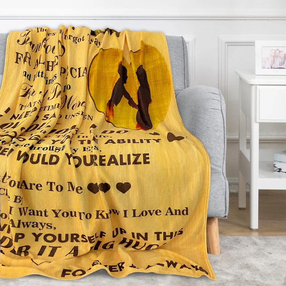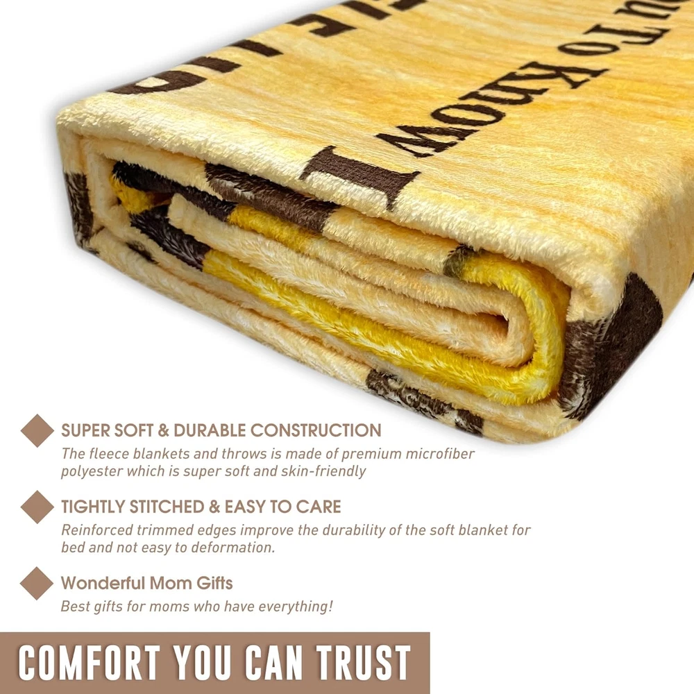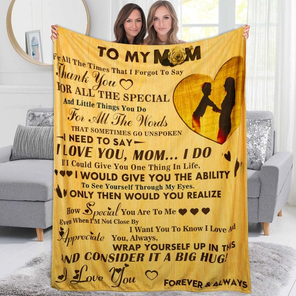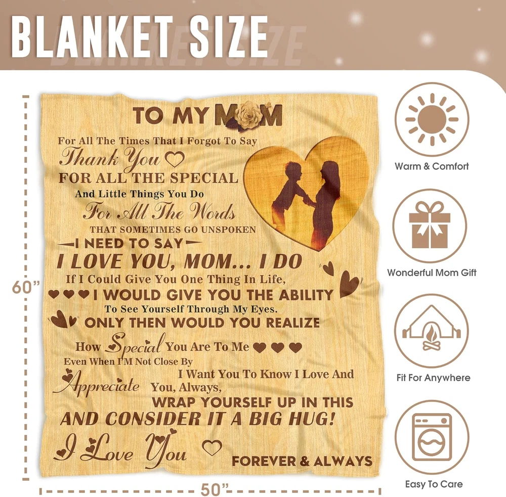 Menu Other Items Feedbacks About Us Contact Us Add To Favorites Gifts for Mom to My Mom Blanket Mom Gifts from Daughter or Son Birthday Gifts for Mom for Christama Day Gift for Women Best Gifts Soft Throw Blanket 50"X60" High Quality: Great gifts for mom, mother throw blanket. Made of 100% microfiber polyester. Mothers day gifts from daughter. Size: 40x50inch-100x130cm, 50x60inch-130x150cm, 60x80inch-150x180cm. Life is for expressing Loving and laughing. Best gifts for moms who have everything. It is a unique gift for your mom, Christmas gift, Thanksgiving presents, birthday gifts, long-distance gifts, Other special occasions to show her, she is loved and appreciated at any time by wraping this blanket. You can imagine how happy it is to have this soft and unique blanket to relax on the sofa, while watching your favorite TV. Warm & Beautiful: Our colors were carefully selected to make a rich and soothing accent to any room decor. Your gift will be a daily reminder of just how much she is loved. Gifts for Mom, Mom Birthday Gifts, Birthday Gifts for Mom, Mom Gifts, Gifts for Mom from Daughter Multifunctional Usage: The mom blanket can easily manage a variety of uses, as a TV blanket, picnic blanket, sofa blanket, bed sheet... Suitable for all seasons. You can use it indoor or outdoor. Best gifts for mom from daughter or son. Easy to clean and maintain: Our ultra soft microfleece mother blankets are machine washable and hand washable.Wash with cold or warm water. It must be dried at low temperature to maintain the quality and color of the to my mom blanket and make the blanket more durable. It is recommended that you clean the blanket before using it for the first time. Product Description Material Our mom blankets are made of microfiber. Perfect amount of thickness to provide you with the right amount of warmth year round. Our expertly crafted design won't make you uncomfortably hot,nor will it leave you cold Occaction Wrapping-yourself on your armchair watching TV, taking a quick nap on the couch, or snuggling in your bed for a longer slumber Machine washable Simply throw it in the washing machine,select the gentle cycle. Washing with cold water,and tumble dry low Item Specification Style Modern Number of Items 1 Pattern print Country of Origin USA Blanket Form Throw Blanket Theme Tv Department Womens Product Dimensions 60"L x 50"W Material Polyester Age Range (Description) Adult Seasons All Water Resistance Level Not Water Resistant Item Weight 1.41 pounds Special Feature Breathable Color To My Mom 04 Recommended Uses For Product Travel, Napping Sport Camping Fabric Type Microfiber,polyester Product Care Instructions Machine Wash Size 50"x60" Shipping FREE FREE SHIPPING We are always working hard to ensure your package arrives as soon as possible. Please understand that some factors like weather, high postal traffic, and the performance of shipping companies are outside of our control. We offer free shipping to the lower 48 states. We do not accept P.O. Boxes. Please provide a physical address. If you have a problem or question regarding your transaction please contact us immediately. We will work with you to resolve any problem you may have. Thank you