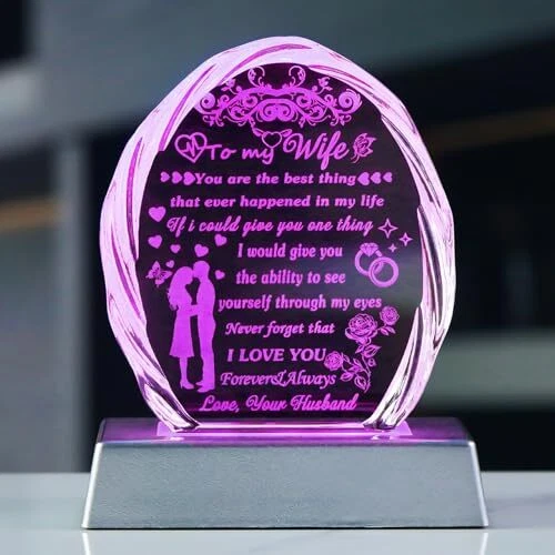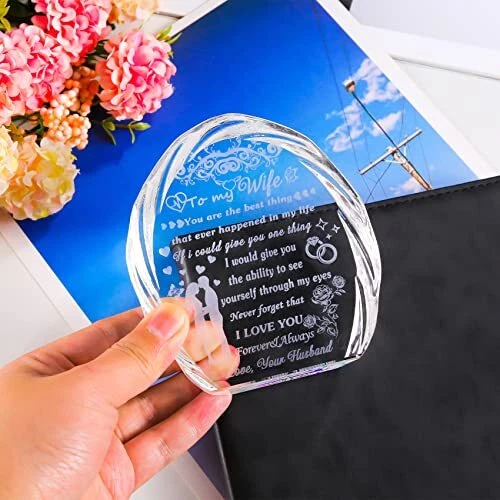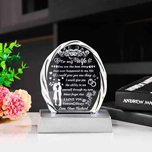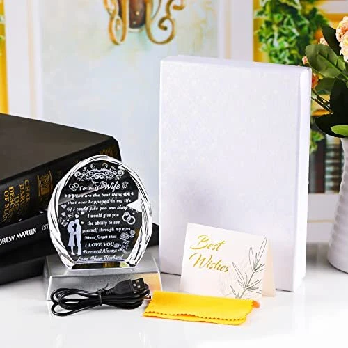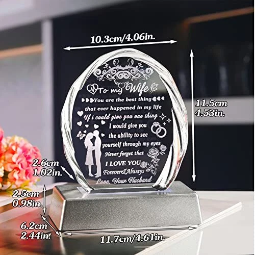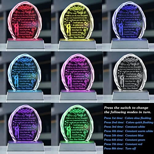 Return Policy Fast Delivery Trusted seller Gifts for Wife with Colorful LED Base from Husband Birthday Anniversary Wife Gift Ideas Romantic for Her, to My Wife Crystal Keepsakes Presents for Mother's Day Christmas Valentine's Day Product Description GIFTS FOR WIFE FROM HUSBAND: Tell your wife how much you love her. This exquisite crystal engraved with heart-warming sayings is the first choice for creative and meaningful gifts for wife, this crystal keepsake can warm your wife's heart and bring her to smile. It is an ideal Birthday, Mother's day, Anniversary, Christmas, New Year, Valentine's day,Thanksgiving, Retirement gift for your wife, she will be delighted to receive this wonderful present on her special day PREMIUM CRYSTAL and CRAFTS: This keepsake is made by K9 crystal, glossier, no bubbles, distortions, each crystal are carefully selected and polished by craftsman with cut facets to better refract lights and increase the sense of splendor, all patterns and words are laser-engraved inside the crystal. it's durable enough to last a ! It will surprise your wife and stay with her for a long time. Crystal Size: 4.53" x 4.06" x 1.02". Light Base Size: 4.61" x 2.44" x 0.98" COLORFUL LED LIGHT BASE: Lamp base available in five constant colours(white, warm white, blue, green, red) that can be adjusted according to your preferences. It will be a great home decor when you put it on the wall shelf, display, bookshelf, etc. The light base comes in two power models, one that uses 3 AAA 1.5V batteries, and the other that uses a charging cable (batteries and plugs are not included in the packaging), which you can use to connect to a computer, car or portable charger BEAUTIFUL HOME DECOR: Sparkly crystal material with faceted, will appear rainbow spots in the light, it will add a touch of sophistication to your home decor, absolutely will be an eyecatching centerpiece decoration. The crystal blocks stand freely on their own, which means that your wife can easily place them on tabletop, shelves, tables, dressers, or nightstands as decorations. She can see this present every day and can make her happy and moved GIFT-READY: This crystal gifts come in a stylish gift box with a shell-shaped engraved crystal, a colorful LED light base, a USB cable, a wiping cloth and a blank gift card(You can write whatever words you want), ready to send it out as a gift at any time Shipping Returns Payment Shipping Shipping is FREE to all addresses other than APO/PO boxes in the lower 48 states. All our stock ships from US-based warehouses. Shipped via USPS or UPS (depending on location and package weight) Unless stated otherwise, all orders will ship within 24-72 hours of your payment being processed. Check our feedback to see the great reviews of FAST shipping we offer. Returns Seller does not accept returns Payment We currently accept payment via eBay managed payments only. Once payment is cleared, we will dispatch your shipment within 1-3 business days. Please refer to the "Shipping" tab for more information regarding shipping speed to your destination.
