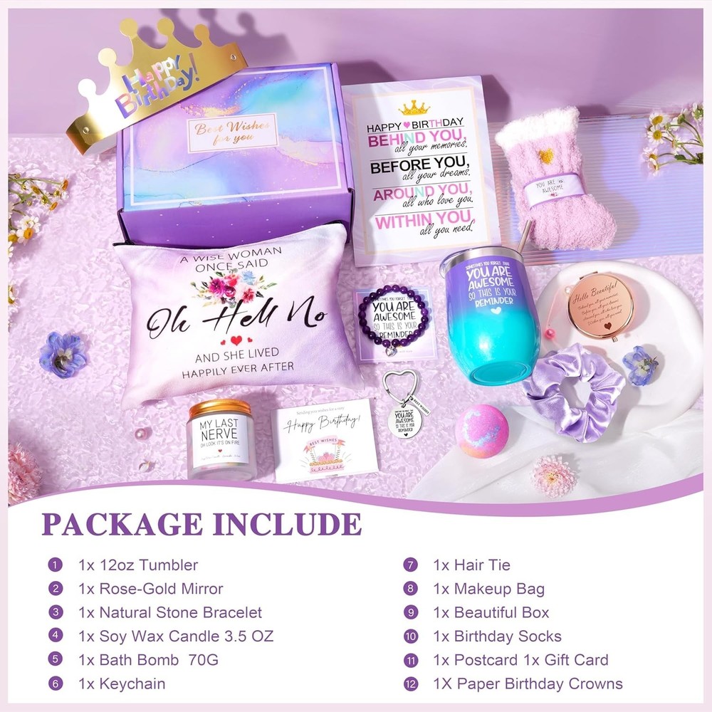 Gifts for Women, Birthday Gifts for Women, Happy Birthday Gifts Basket, Gift Set for Best Friends Female Sister Mom Wife Her Girlfriend Coworker Bestie Bff Unique Birthday Gifts For Women: Our gift box is made to impress every lady at first sight,try this unforgettable cute gift set for her! Your best friend will certainly feel spoiled! On her birthday, sister gifts from sister gift box is a meaningful gifts for women, bestie, bff, best friend, coworker from sisters or friends to warm her heart & let her know she is special Practical 14pcs Sister Gift Basket From Sisters: Well-designed packaging box contains the 1*12oz wine tumbler, 1* sst straw, 1*rose gold mirror, 1* , 1*bath bomb,1* natural stone bracelet, 1* pair of birthday socks, 1*cosmetic bag,1 x hair tie,1*gift box, 1 x postcard, 1x keychain1* paper birthday crowns, 1*greeting card with envelope. (We have a blank greeting card is included, and you can write your blessing freely. This will be the most mysterious surprise to her) Best Friends Gifts For Women: Imagine the surprise of receiving this gift on her birthday. She can use candle will make her feel soothing and is great for sleep promoting, It can burn for about 40 hours, keep it away from flammable materials, extinguish it before going to bed, make sure children and pets will not come into contact with the burning candle. Enjoy the happiness of making up with rose gold mirror and makeup bag and have a morning coffee or afternoon drink with her new favorite wine tumbler. Good day starts with your birthday gift Unique Design for Bestfriend Birthday: This is a birthday gift set. Our handmade gift set are beautifully designed with an elegant touch. Say happy birthday with a super cool gift basket. A quote “YOU ARE AWESOME” makes the wine tumbler be a unique gift to celebrate her birthday time. Best gift ideas for best friend wife, mother, sister, daughter, coworker, or girlfriend. We believe that her deserves the best Surprise Gift Box: All packaged in a high-quality beautiful gift basket box, no need to repackage. We have professional after-sales team, can help you solve any question in 24 hours. If you run into any issue, just drop us an ! We are here to make our customer satisfied
