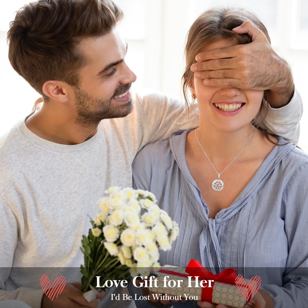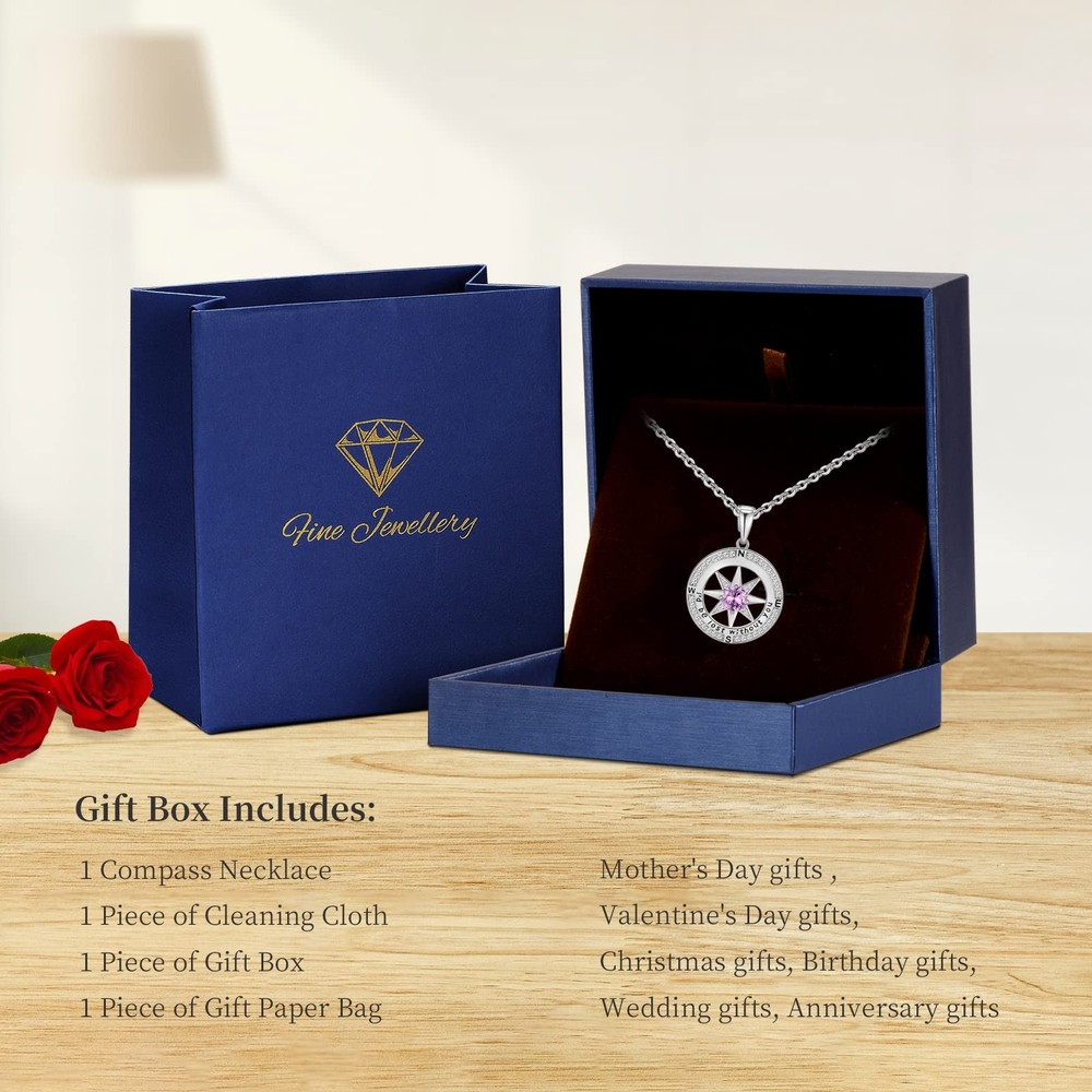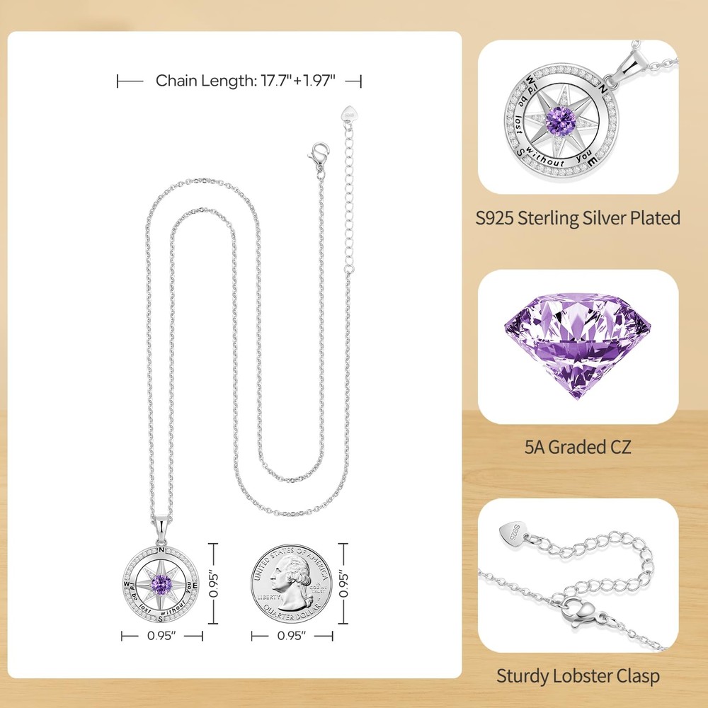 Gifts For Wife Birthday Gift for Girlfriend Compass Pendant S925 Birthstone Jewelry for Women Romantic Anniversary Necklace for Her on Christmas New Year Valentines Day Mother's Day(Feb-Amethyst) 【Love Gift for Her】This silver pendant necklace engraved a quote “I’d be lost without you”, love and romance, will be a meaningful gift for your loved ones to feel loved and cherished by you on Birthday, Wedding Anniversary, Christmas, Valentine's Day and Mother’s Day, etc. 【S925 Sterling Silver Necklace】The necklace is made of S925 sterling silver with multi-layered 18k white gold plating that could be last for a long time, not easy to fade. And we use 5A cubic zirconia to decorate compass pendant to be more sparkly, suitable for daily outfits. 【Birthstone Necklace - Birthday Gifts for Her】The 12-month birthstone necklace makes a unique jewelry gift for woman, such as wife gifts for birthday/anniversary, birthday/ anniversary gift for girlfriend , birthday gifts for mom daughter, Valentine’s Day gift, Christmas gift, Mother’s Day gift, anniversary year gift for woman. This necklace will make her feel your love and company wherever she is. 【Adjustable Size & Sturdy Cable Chain】S925 Silver Chain length:17.7'+1.97' extention, which can be adjusted according to your needs. That features a cable chain with a sturdy lobster clasp which is strong enough that will not break. 【Package with a Gift Box and Gift Bag】The necklace is gifted with a delicate gift box and gift paper bag for you to give directly to your loved ones without packing it yourself. If you have any questions, pls contact us and we will be glad to help you.